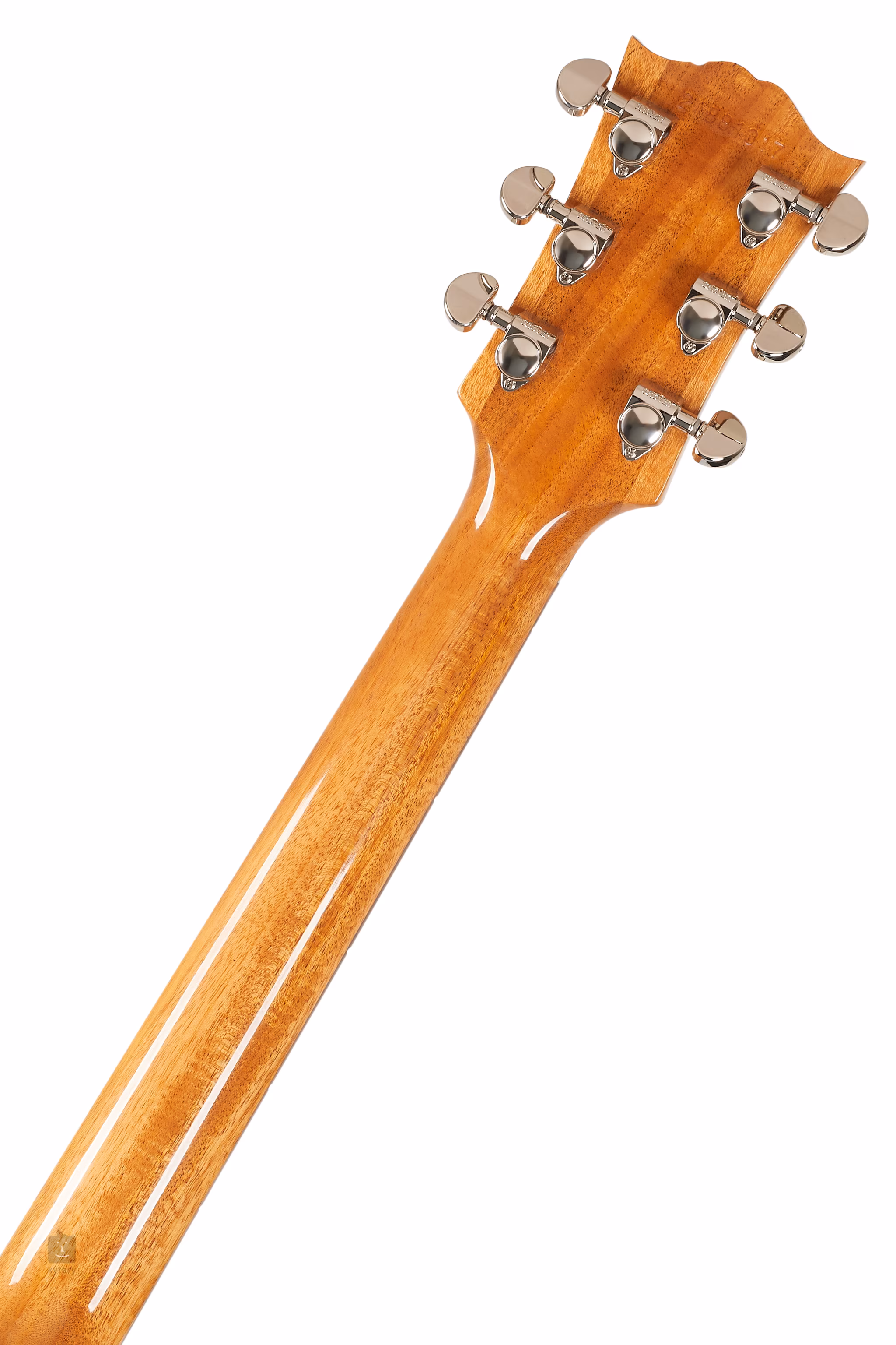 SJ-200 Studio Walnut je díky užšímu tělu (slim body) a krku s profilem Advanced Response tím nejpohodlnějším modelem Super Jumbo z katalogu Gibson. Přední deska kytary je zhotovena z masivního smrku Sitka, zadní deska a luby jsou vyrobeny z masivního ořechu. Rezonanci topu podporuje ručně snížené žebrování typu X. K mahagonovému krku je přilepen ořechový hmatník osazený dvaceti pražci velikosti Standard. Orientaci po ploše hmatníku usnadňují zdobné perleťové poziční značky (Mother-of-pearl Graduated Crowns).