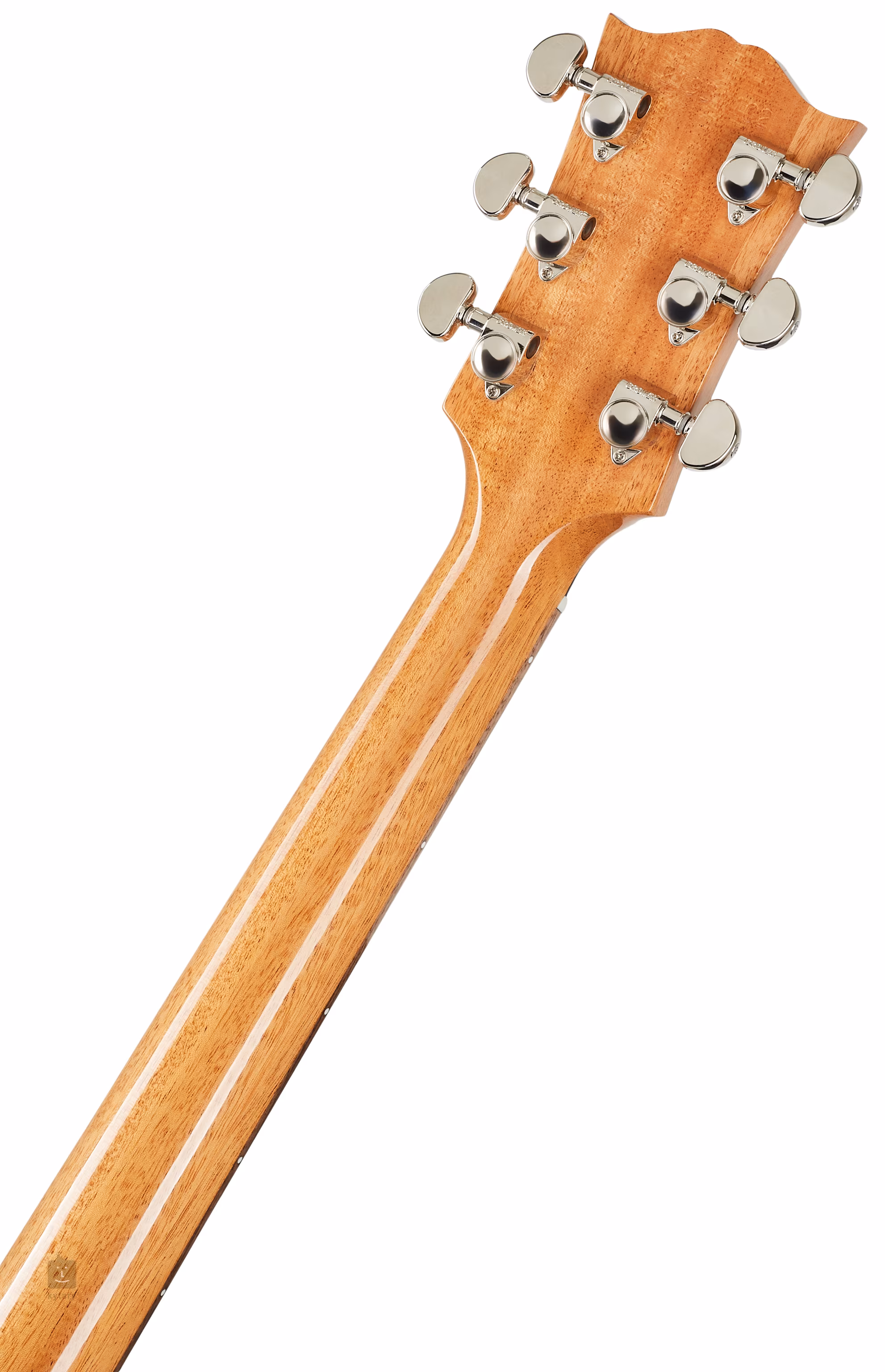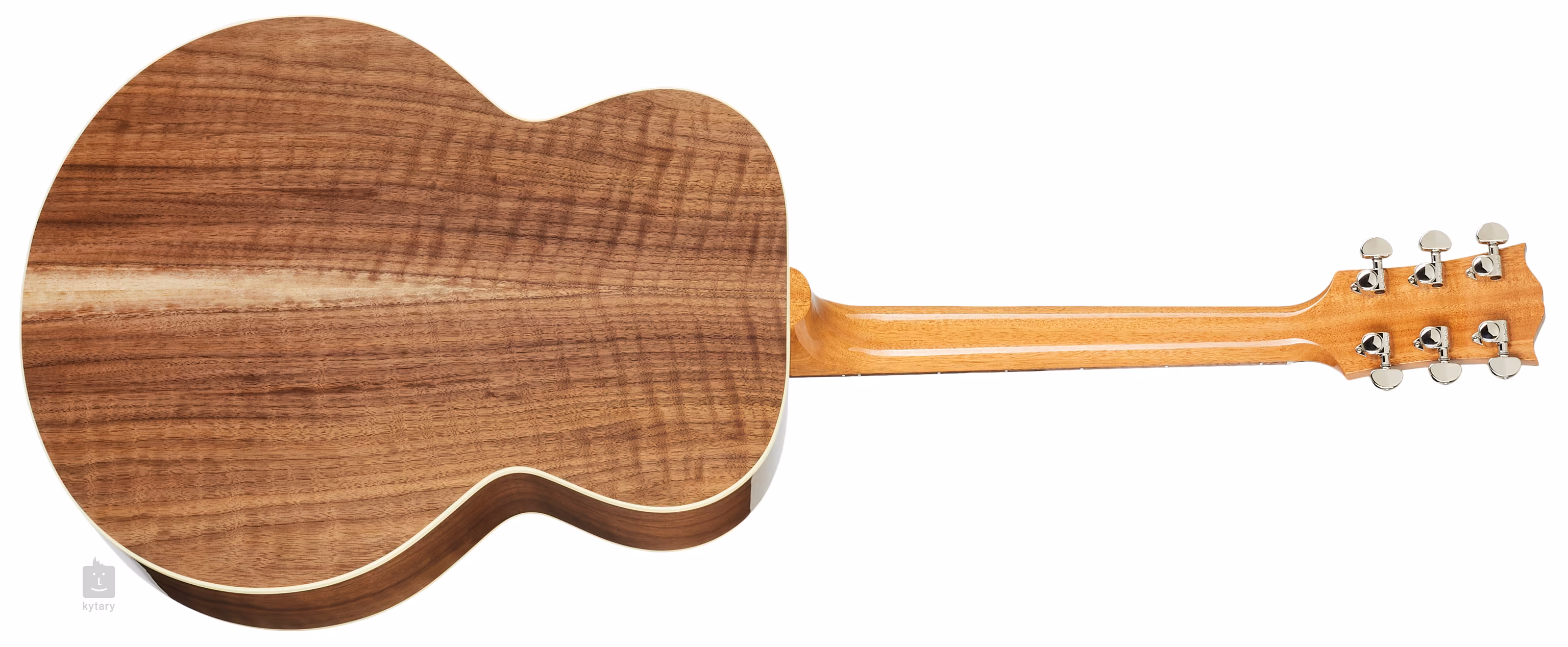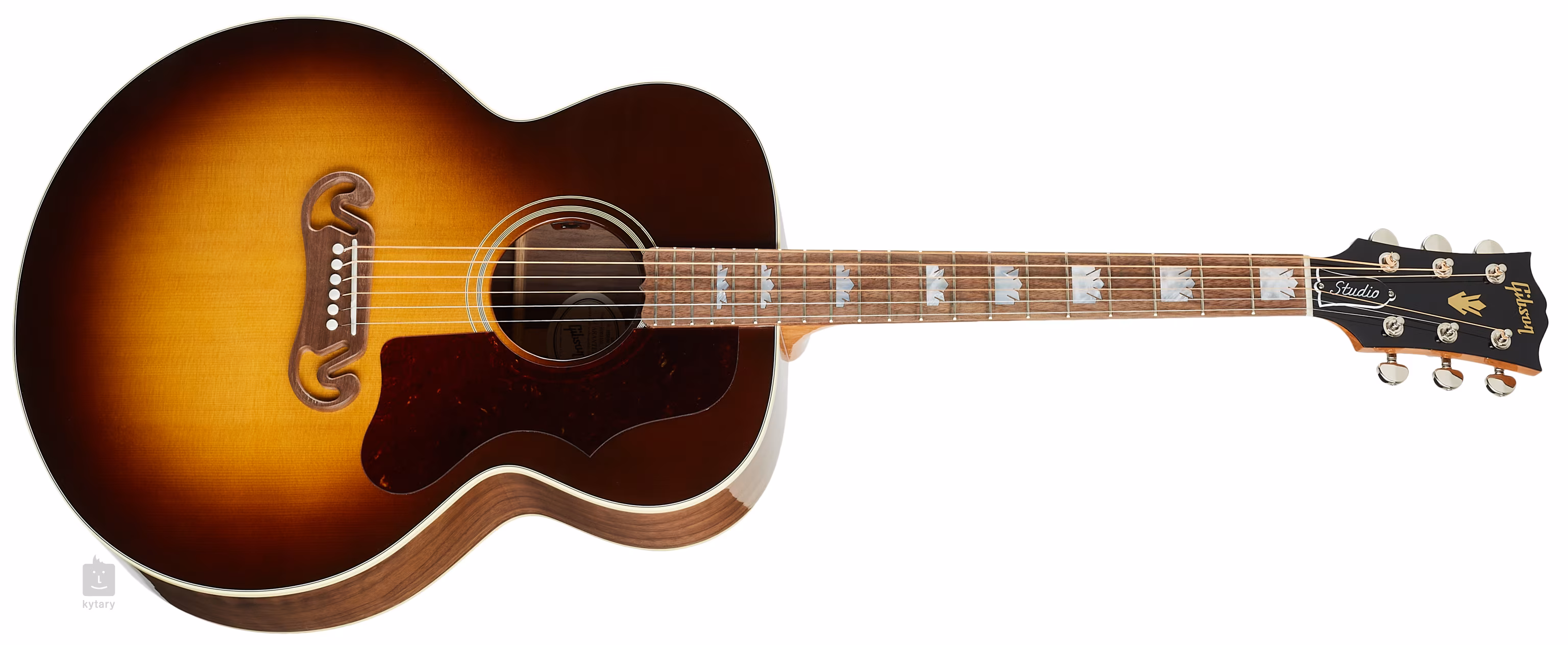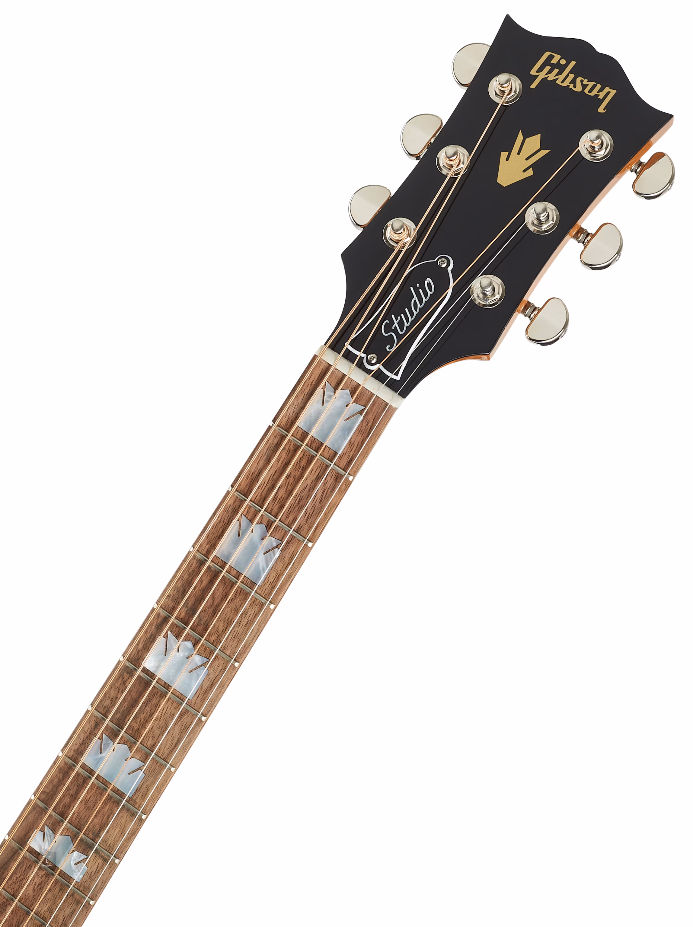 SJ-200 Studio Walnut je díky užšímu tělu (slim body) a krku s profilem Advanced Response tím nejpohodlnějším modelem Super Jumbo z katalogu Gibson. Přední deska kytary je zhotovena z masivního smrku Sitka, zadní deska a luby jsou vyrobeny z masivního ořechu. Rezonanci topu podporuje ručně snížené žebrování typu X. K mahagonovému krku je přilepen ořechový hmatník osazený dvaceti pražci velikosti Standard. Orientaci po ploše hmatníku usnadňují zdobné perleťové poziční značky (Mother-of-pearl Graduated Crowns).