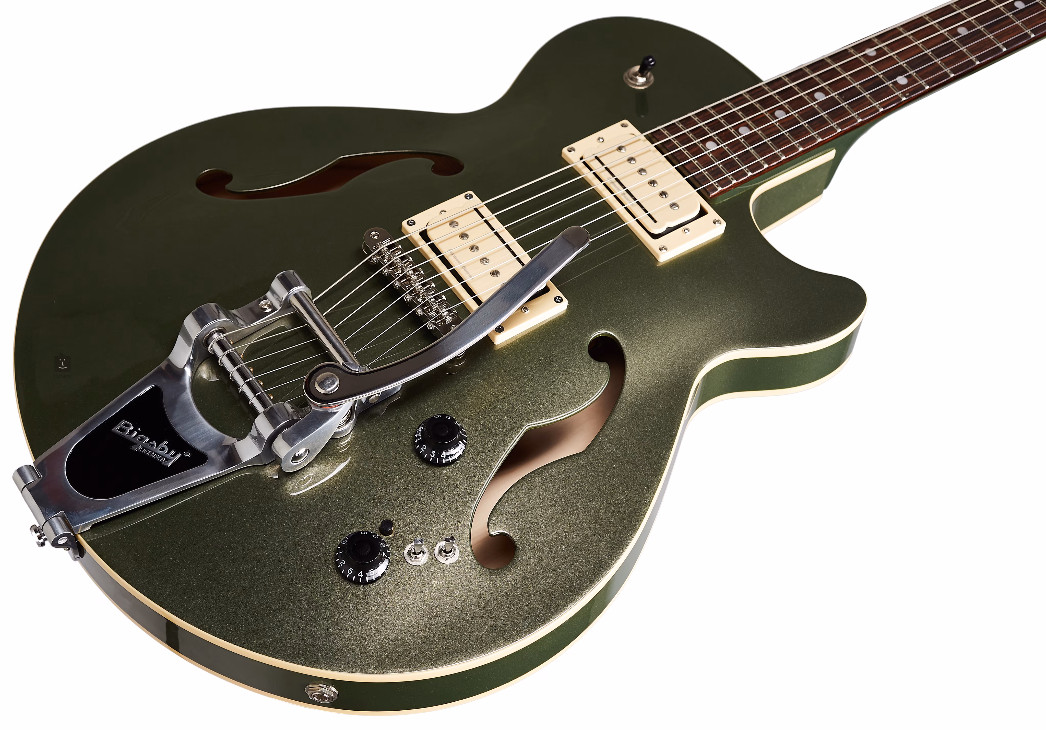 Montreal Premier LTD Desert Green je lubová semiakustická kytara z limitované řady kanadské značky Godin. Nabízí kvalitní zpracování, atraktivní vzhled v barevné úpravě Desert Green a dva humbuckery P-Rail renomované značky Seymour Duncan, které vám dle libosti poskytnou zvuk humbuckeru, P90 nebo single-coilu.