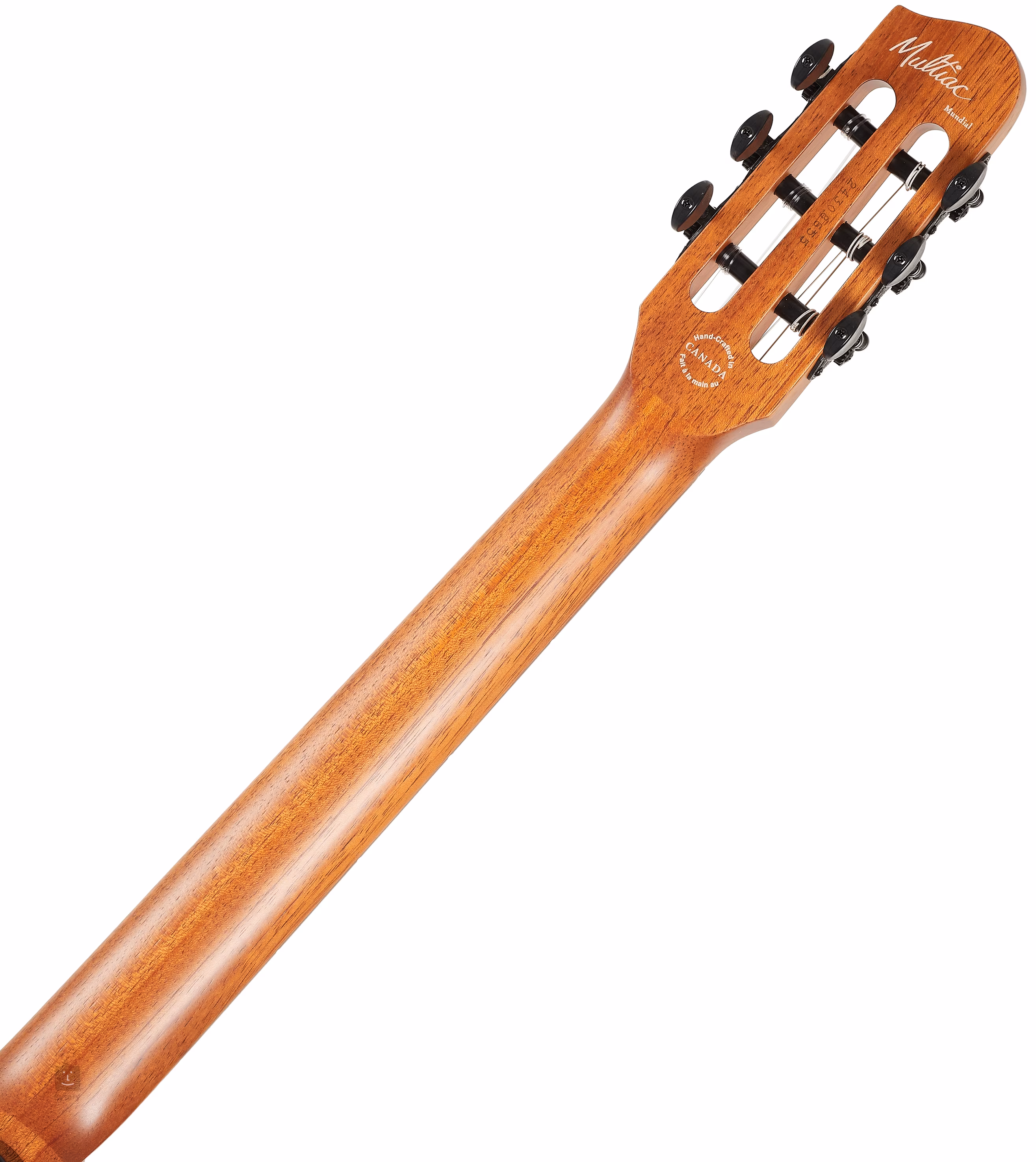Základ zvuku klasické elektroakustické kytary Multiac Mundial Onyx Black with Bag tvoří lubové tělo ze stříbrolistého javoru a top z masivu cedru. K přišroubovanému krku ze španělského cedru je přilepen palisandrový hmatník osazený dvaadvaceti pražci. Nylonové struny kytary jsou uchyceny přes nultý pražec z materiálu Graphtech v klasických otevřených ladících mechanikách s převodovým poměrem 16:1 a palisandrové kobylce. Pěkné zpracování podtrhuje finiš Onyx Black..