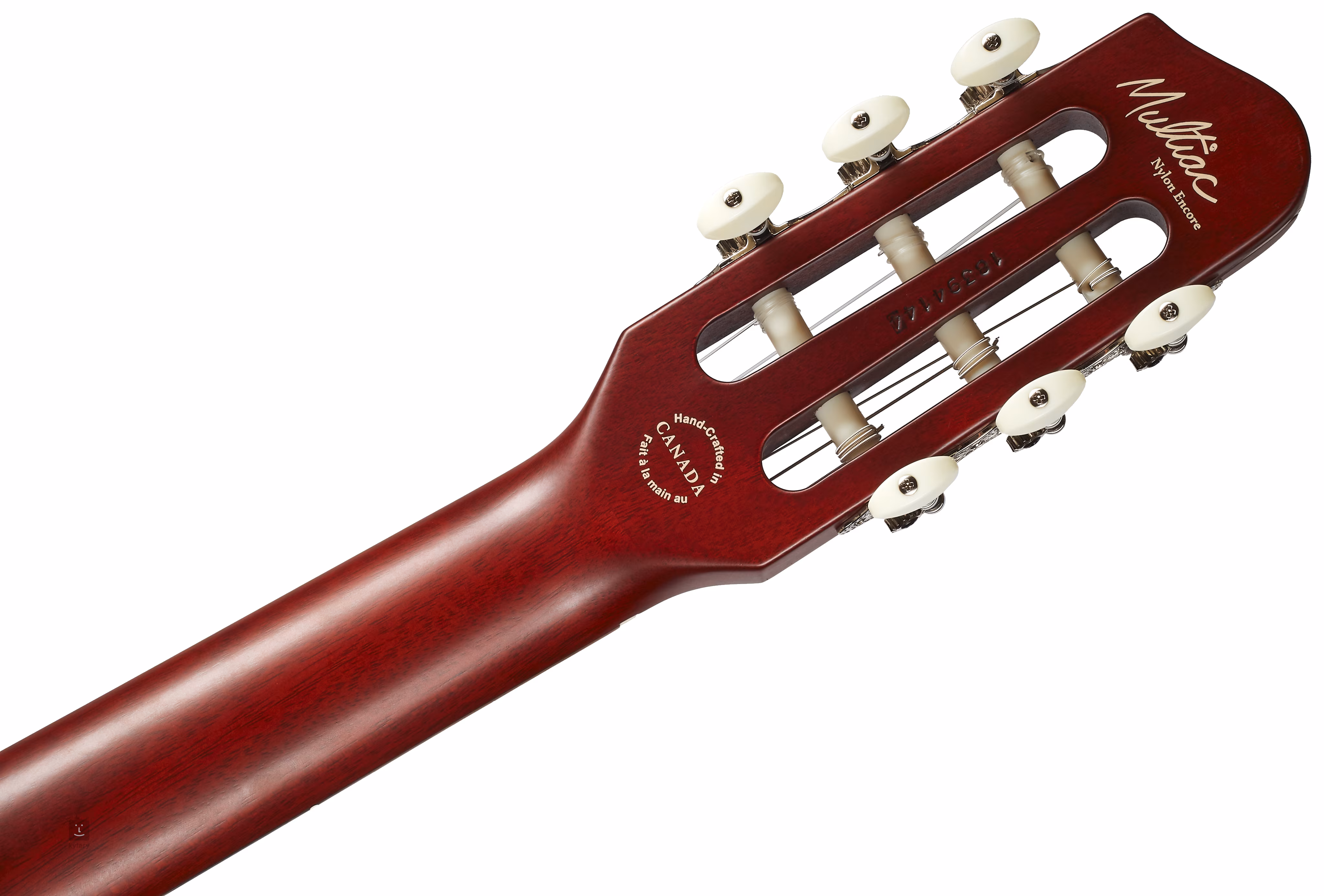 Základ zvuku modelu Multiac Nylon Encore Natural SG tvoří tělo z komorovaného stříbrolistého javoru a masivní cedrový top. K přišroubovanému mahagonovému krku je přilepen palisandrový hmatník osazený dvaadvaceti pražci. Díky komorovanému designu těla je kytara naprosto imunní vůči zpětné vazbě, takže ani hlasité koncerty s kapelou nepředstavují problém.