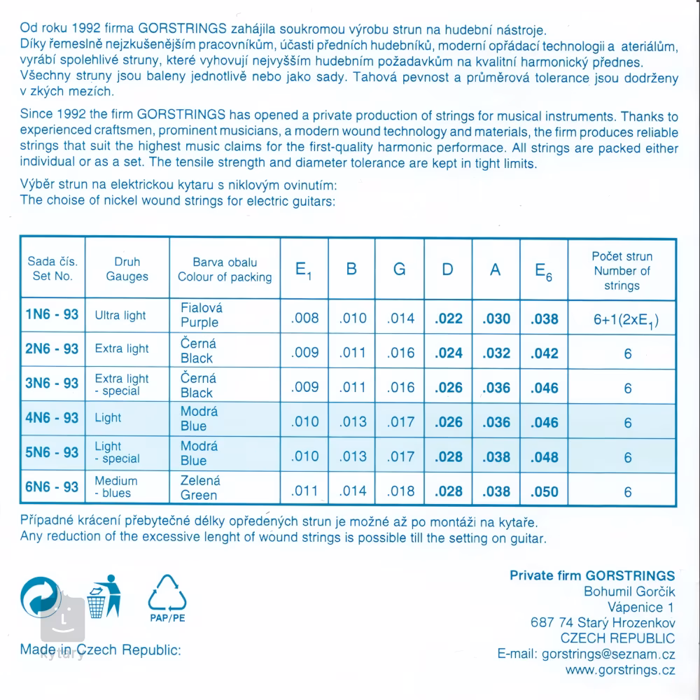 Struny pro elektrické kytary od českého výrobce Gorstrings nabízí jasný, frekvenčně vyvážený tón, který z vaší kytary vytáhne její pravý potenciál. Jejich základem je kulaté ocelové jádro, které je vinuté poniklovanou ocelí – ta jim dodává vřelejší, zakulacený charakter. Struny jsou vyrobeny z prvotřídních materiálů a prošly rukama těch nejlepších českých řemeslníků. Dopřejte své kytaře to nejlepší se strunami Gorstrings!