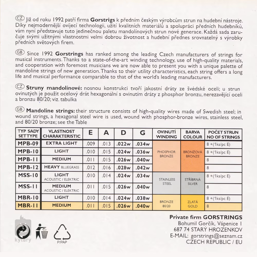 Struny pro mandolínu od českého výrobce Gorstrings jsou vyrobeny z prvotřídních materiálů a prošly rukama těch nejlepších českých řemeslníků. Jejich základem je šestihranné jádro z prvotřídní švédské oceli, které je ovinuté oblíbenou bronzovou slitinou 80/20 – ta strunám dodává jasný, průrazný tón, který z vaší mandolíny vytáhne její pravý potenciál. Struny jsou zakončeny smyčkou pro zavěšení na háček struníku. Dopřejte svému nástroji to nejlepší se strunami Gorstrings!