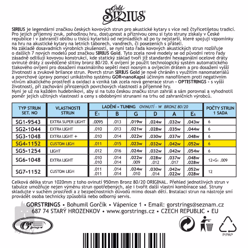 Struny SIRIUS mají na českém trhu dlouhou tradici a jsou velmi oblíbené hlavně mezi trampy a folkaři. Jejich velkým lákadlem je nejen příznivá cena, ale také příjemný zvuk a pohodlná hra. Tato nová řada Sirius Gold se však od původních siriusek v několika ohledech liší. Struny mají šestihranné jádro vinuté oblíbenou bronzovou slitinou (80/20), díky níž mají jasný, zvonivý zvuk, který vynikne u každého táboráku. Navíc jsou potaženy speciálním antikorozním potahem, který značně prodlužuje jejich životnost. Výsledkem je zcela nová generace strun Optistrings, která vyniká brilantním vřelým zvukem, vysokou odolností a extrémně dlouhou výdrží.