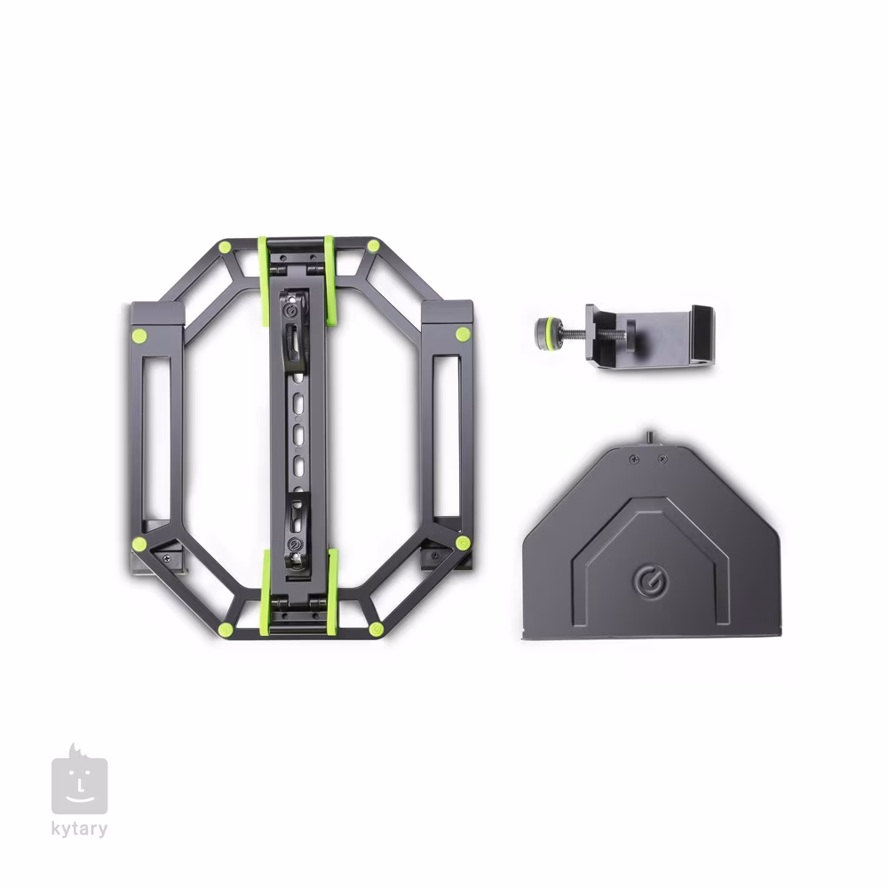 Stojan je vyroben z pevné, ale lehké hliníkové konstrukce s odolnou práškovou povrchovou úpravou. Jeho základna i odkládací polička mají protiskluzové gumové podložky, které drží odložené zařízení bezpečně na místě i při dynamickém živém hraní. Rychlé nastavení úhlu zajišťují flexibilní zámky, které umožňují přesné naklopení a současně pevné uzamčení polohy. Díky tomu si snadno nastavíte ideální pracovní úhel pro mixáž, produkci nebo prezentaci.