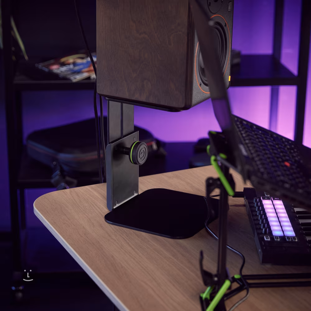 Se stojany Gravity SP 3102 CB můžete umístit své studiové monitory přímo na stůl, aniž byste se museli obávat o stabilitu nebo vysoké nároky na drahocený prostor vaší pracovní plochy. Díky plynulému nastavení výšky lze monitorovací reproduktory přesně sladit s polohou vašeho sezení a vytvořit tak ideální sweetspot!