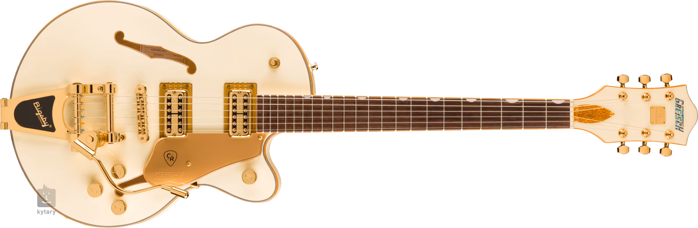 Struny jsou uchyceny v uzamykatelných die-cast ladících mechanikách a přes kobylku Adjusto-Matic v licenčním Bigsby B70 tremolu. Klasický oku lahodící design kytar Gretsch podtrhuje řada stylových prvků - od elegantní zlaté lemovky doplněné černobílými linkami přes hardware ve zlaté barvě po Gold Plexi pickguard.