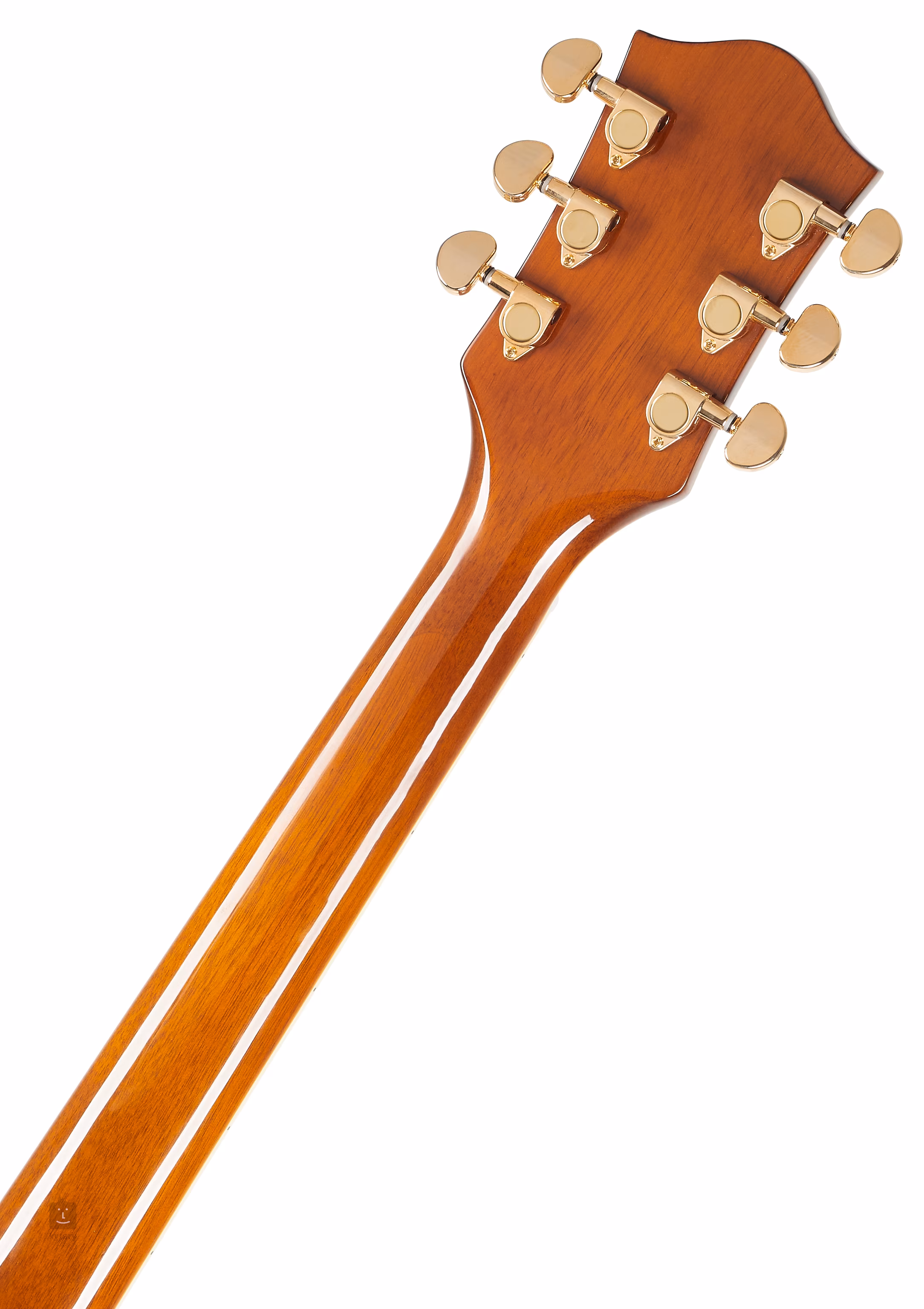 Přesné ladění zaručuje uchycení strun přes nultý pražec z umělé kosti ve firemních Die-Cast ladících mechanikách a v kobylce Adjusto-Matic usazené na pevné základně z fíkovníku. Licenčním tremolem Bigsby B60 zpestříte hru decentními zvukovými efekty. Klasický oku lahodící design kytar Gretsch podtrhuje řada stylových prvků - od klenuté konstrukce těla s rozšířenými F otvory pro lepší akustickou projekci, elegantní lemovky (Aged White) doplněné černobílými linkami, hardware ve zlatém provedení po Cream Plexi pickguard se zlatým logem Gretsch.