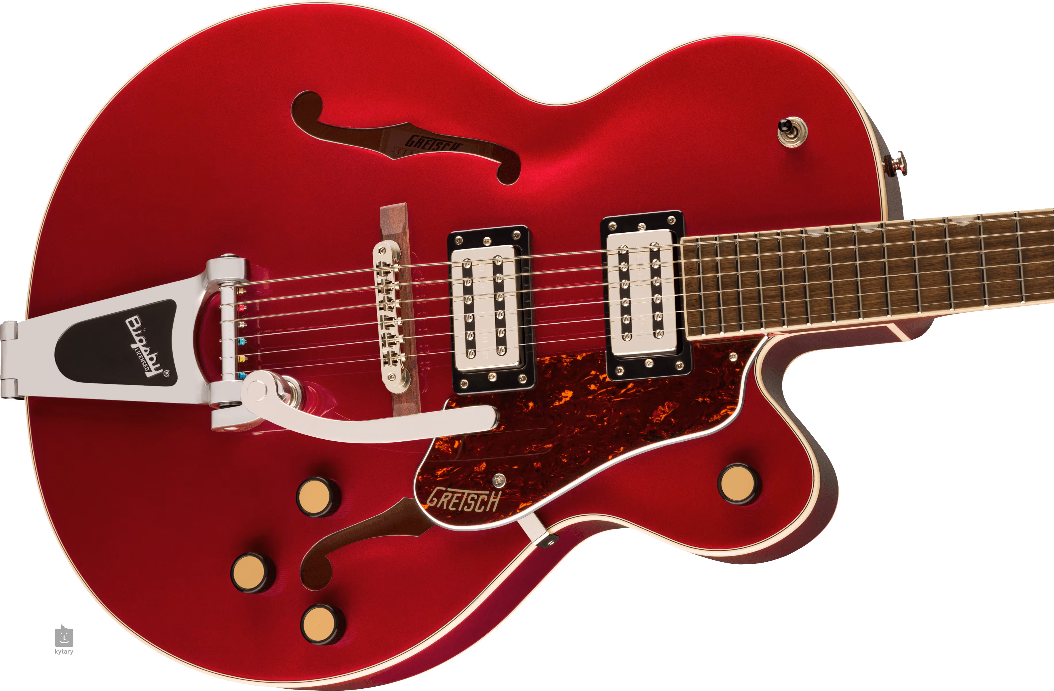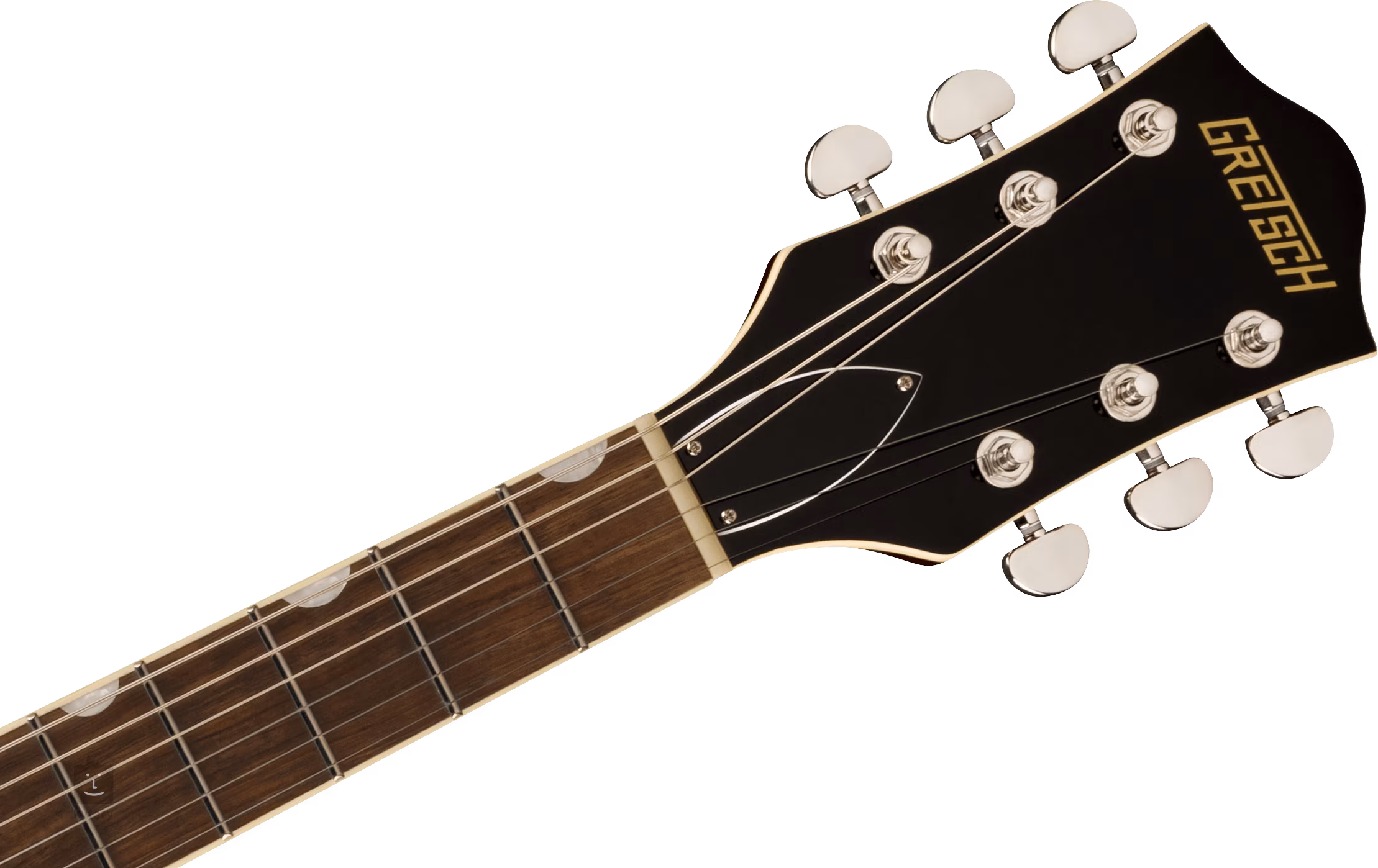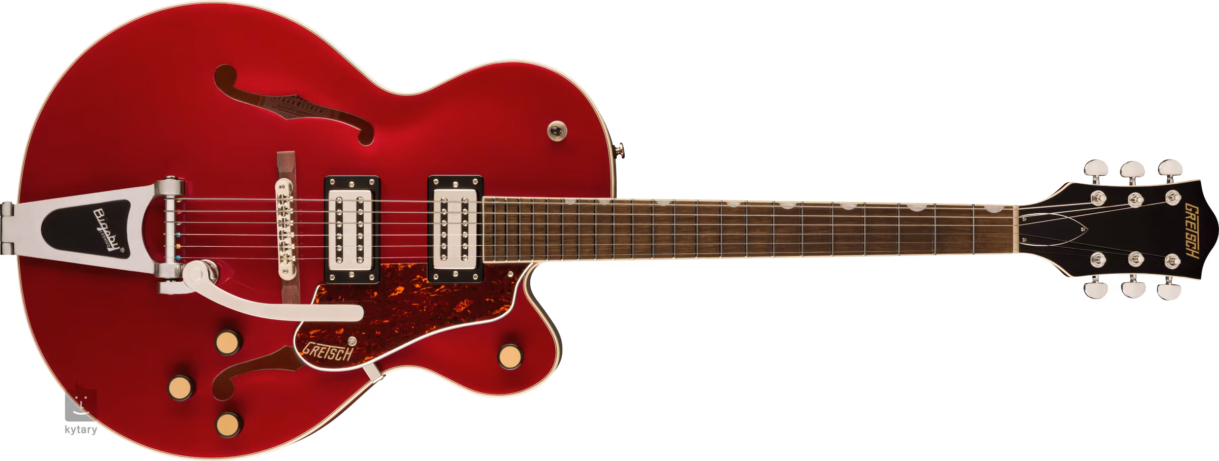 Struny jsou ukotveny přes nultý pražec z kosti ve firemních die-cast ladicích mechanikách a přes kobylku Adjusto-Matic usazené na dřevěné základně v licenčním tremolu Bigsby B60. Klasický oku lahodící design kytar Gretsch podtrhuje řada stylových prvků - od klenuté konstrukce těla s F otvory, elegantní lemovky s jemným nádechem patiny (Aged White), “radio” style potenciometrů, niklového hardware po třívrstvý pickguard z imitace želvoviny se zlatým logem Gretsch.