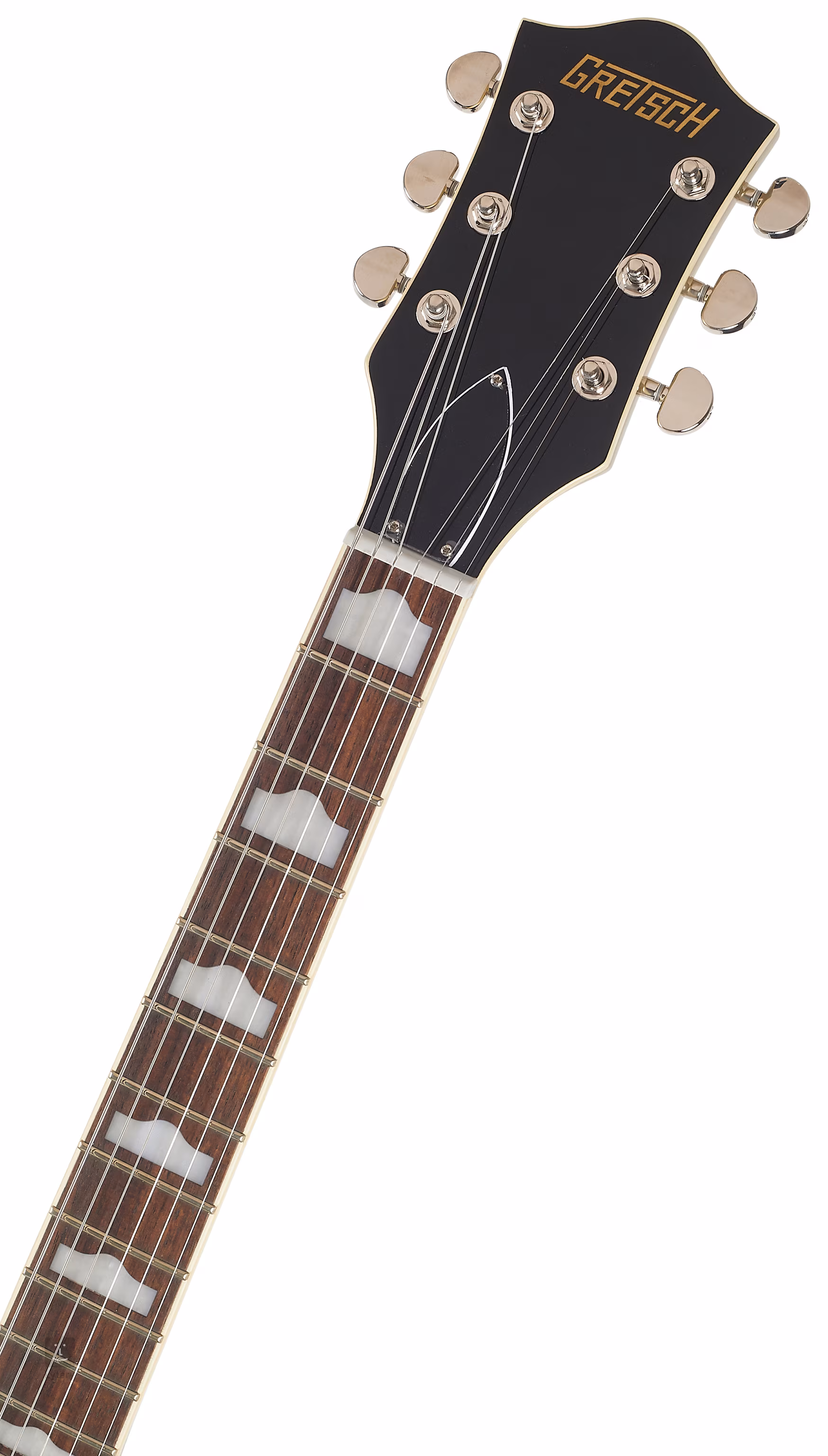 Přesné ladění zaručuje uchycení strun přes nultý pražec z umělé kosti ve firemních Die-Cast ladících mechanikách a v kobylce Adjusto-Matic usazené na pevné dřevěné základně. Licenčním tremolem Bigsby B60 zpestříte hru decentními zvukovými efekty. Klasický oku lahodící design kytar Gretsch podtrhuje řada stylových prvků - od klenuté konstrukce těla s rozšířenými F otvory pro lepší akustickou projekci, elegantní lemovky s jemným nádechem patiny (Aged White) a černobílé výložky, potenciometrů ve vintage stylu, niklového hardware po třívrstvý pickguard z imitace želvoviny.