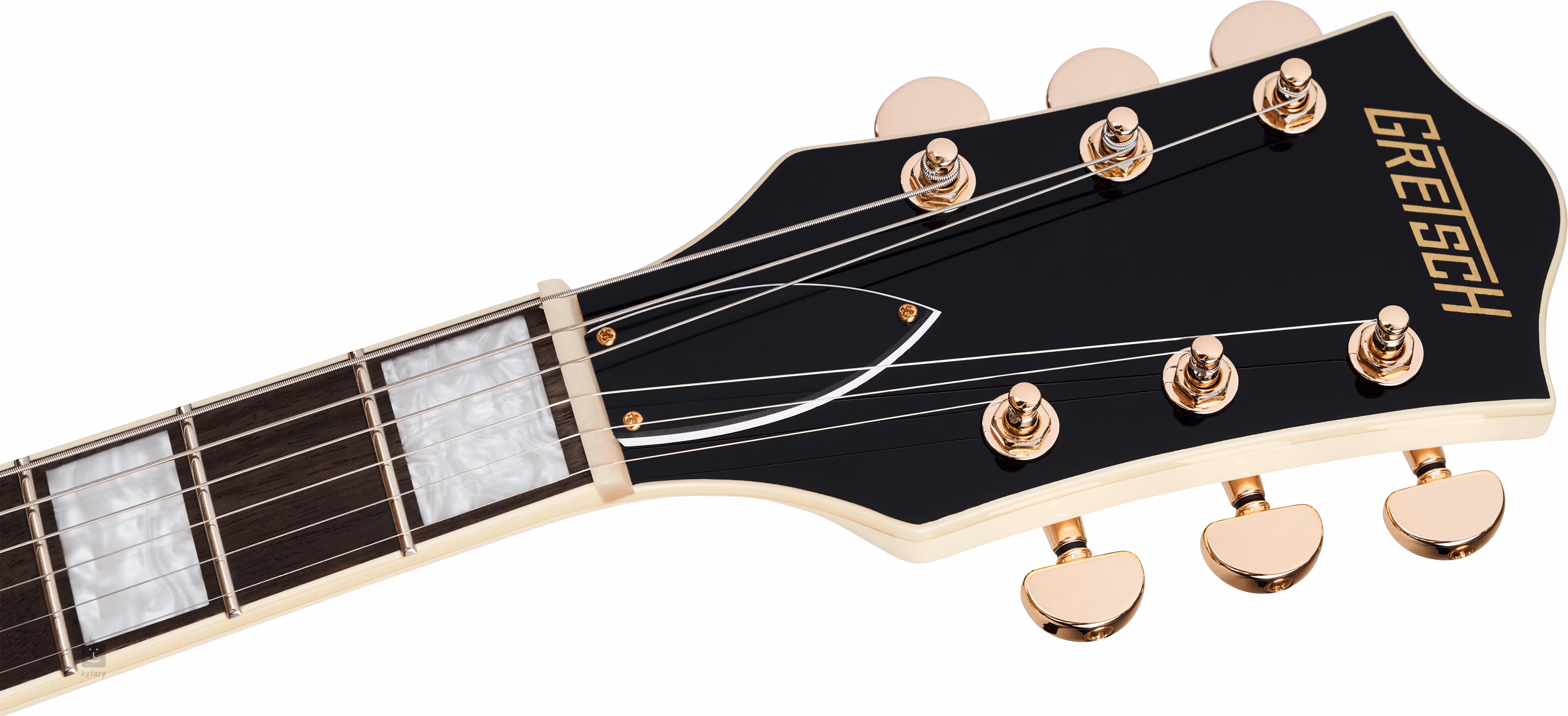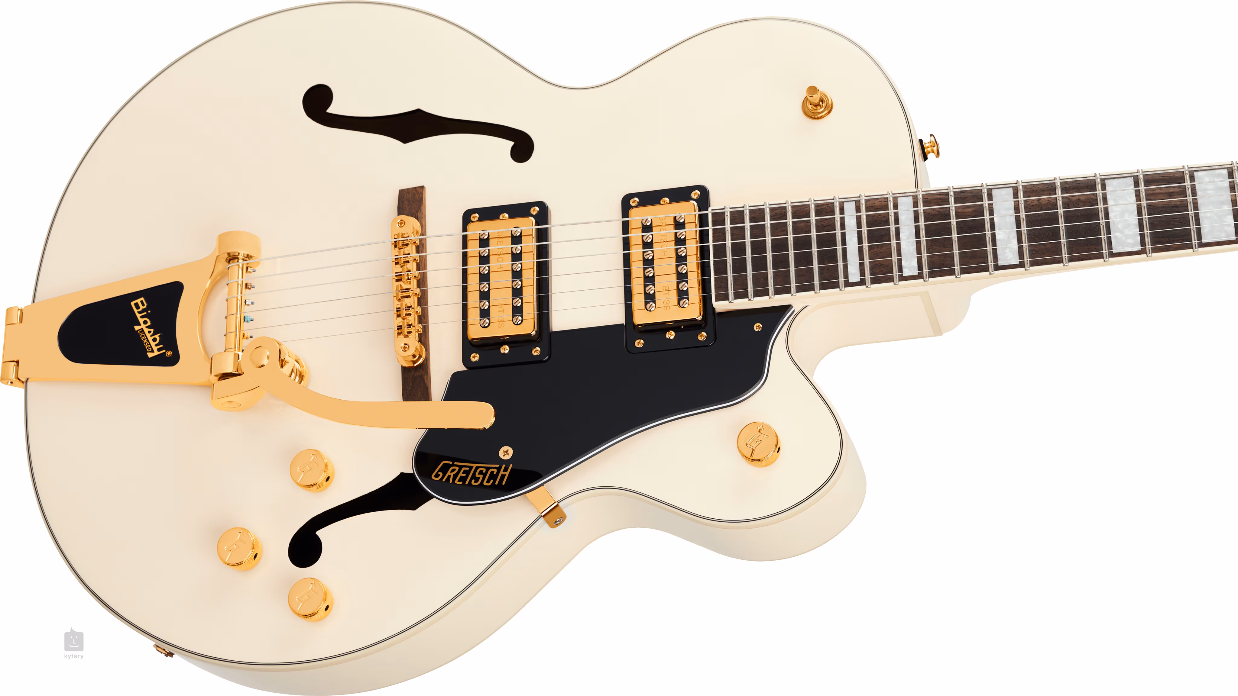 Struny jsou ukotveny přes nultý pražec z kosti ve firemních die-cast mechanikách a přes kobylku Adjusto-Matic usazené na dřevěné základně v licenčním tremolu Bigsby B60. Klasický oku lahodící design kytar Gretsch podtrhuje řada stylových prvků - od klenuté konstrukce těla s F otvory, elegantní obvodové lemovky, hardware ve zlatém provedení po černý třívrstvý pickguard se zlatým logem Gretsch.