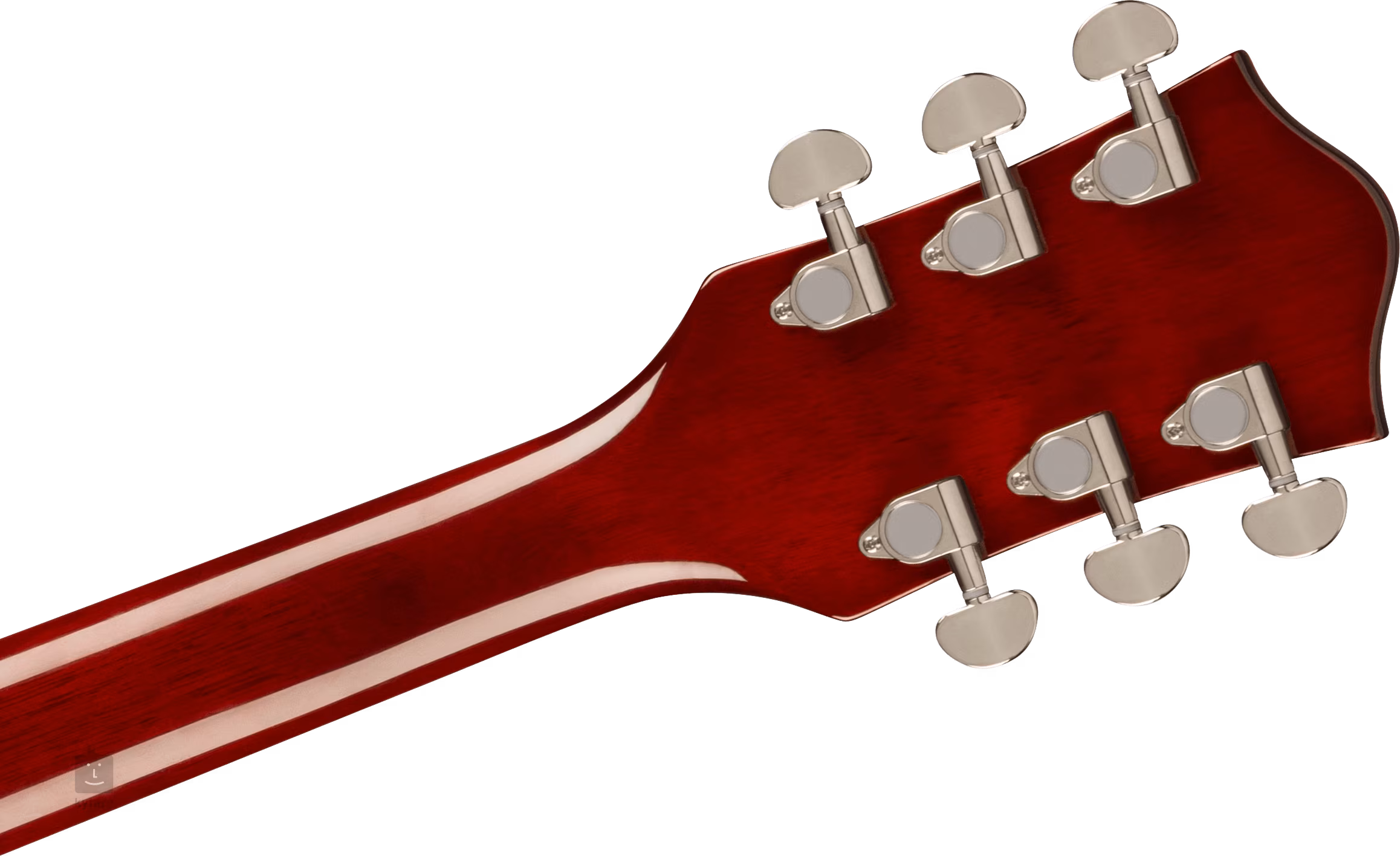 Struny jsou ukotveny přes nultý pražec z kosti ve firemních die-cast mechanikách a přes kobylku Adjusto-Matic ve struníku (V-Stop tailpiece). Klasický oku lahodící design kytar Gretsch podtrhuje řada stylových prvků - od klenuté konstrukce těla s F otvory, elegantní lemovky s jemným nádechem patiny (Aged White), "radio" style potenciometrů, niklového hardware po třívrstvý pickguard z imitace želvoviny se zlatým logem Gretsch.