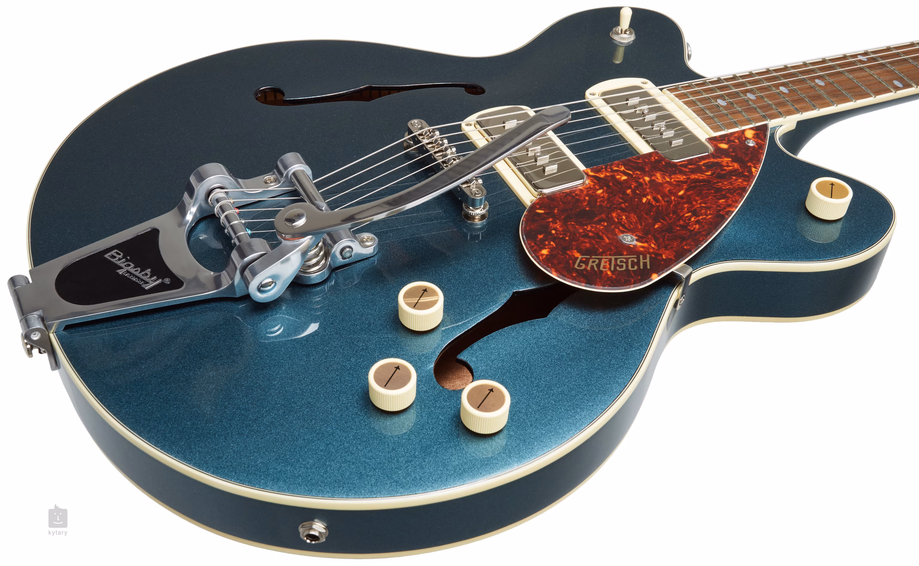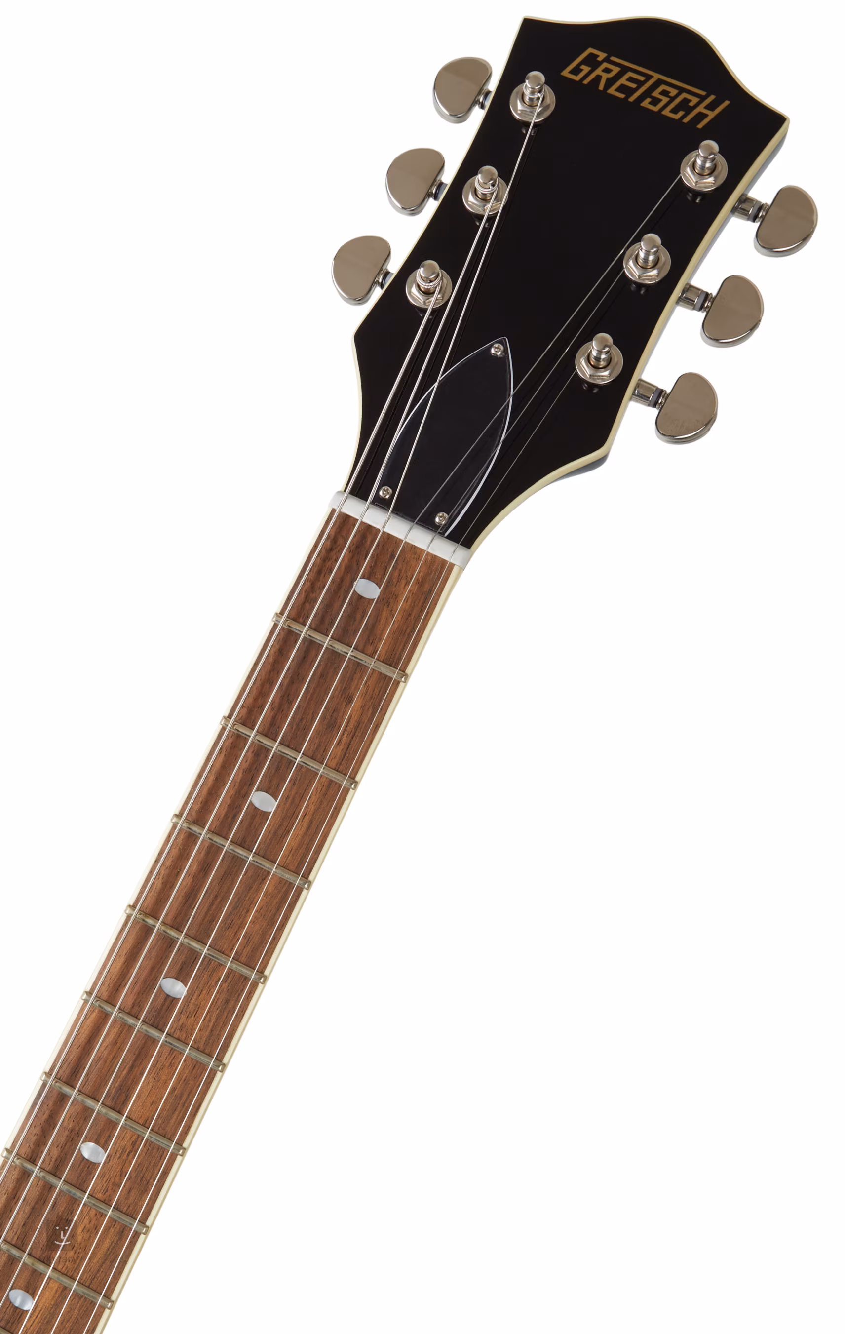 Přesné ladění zaručuje uchycení strun přes nultý pražec z umělé kosti ve firemních Die-Cast ladících mechanikách a v kobylce Adjusto-Matic. Licenčním tremolem Bigsby B70 zpestříte hru decentními zvukovými efekty. Klasický oku lahodící design kytar Gretsch podtrhuje řada stylových prvků - od rozšířených F otvorů pro lepší akustickou projekci, stylizovaných rámečků snímačů, elegantní lemovky s jemným nádechem patiny (Aged White) doplněné černobílými linkami, niklového hardware po třívrstvý pickguard z imitace želvoviny se zlatým logem Gretsch.