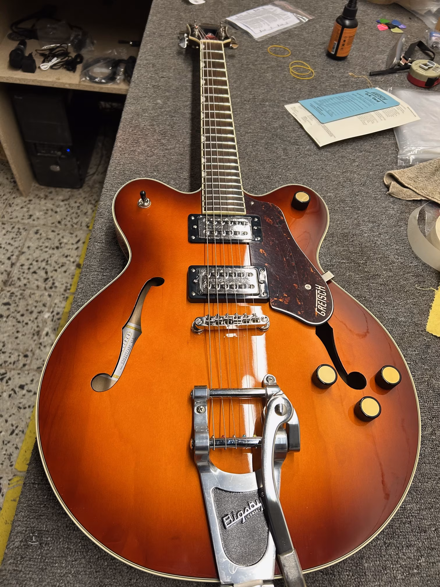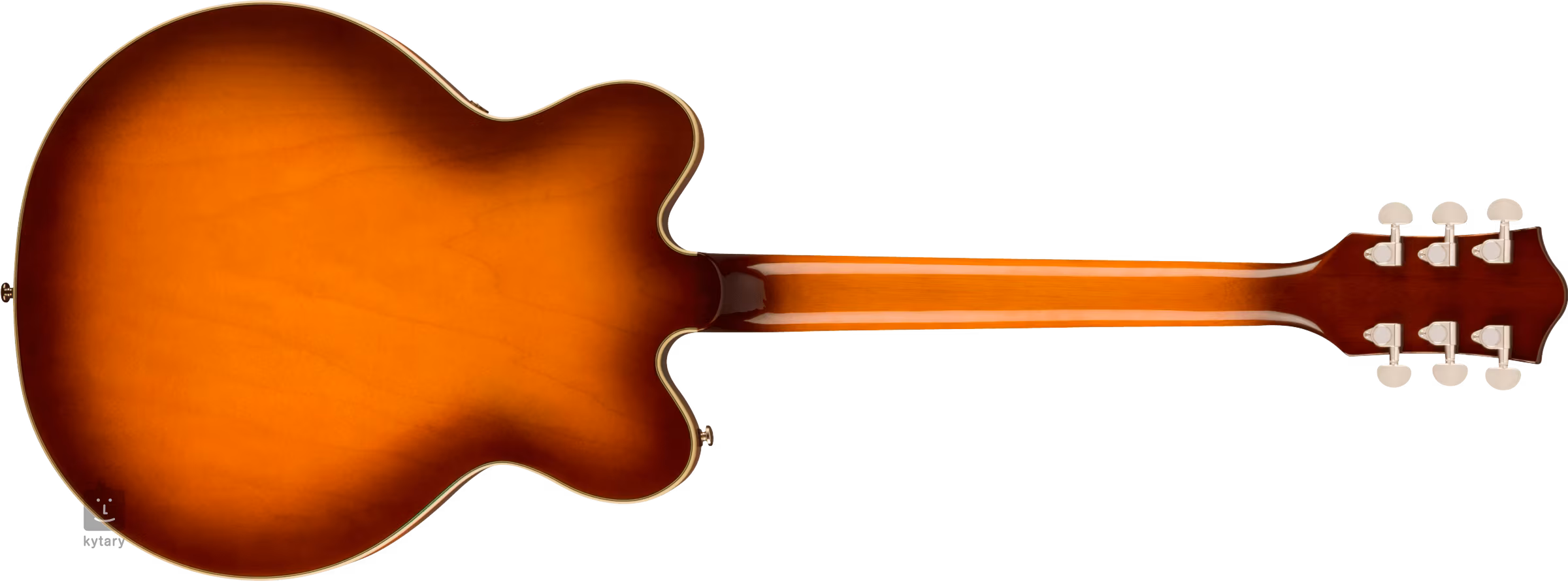 Struny jsou ukotveny přes nultý pražec z kosti ve firemních die-cast ladících mechanikách a přes kobylku Adjusto-Matic v licenčním tremolu Bigsby B70. Klasický oku lahodící design kytar Gretsch podtrhuje řada stylových prvků - od klenuté konstrukce těla s F otvory, elegantní lemovky s jemným nádechem patiny (Aged White), "radio" style potenciometrů, niklového hardware po třívrstvý pickguard z imitace želvoviny se zlatým logem Gretsch.