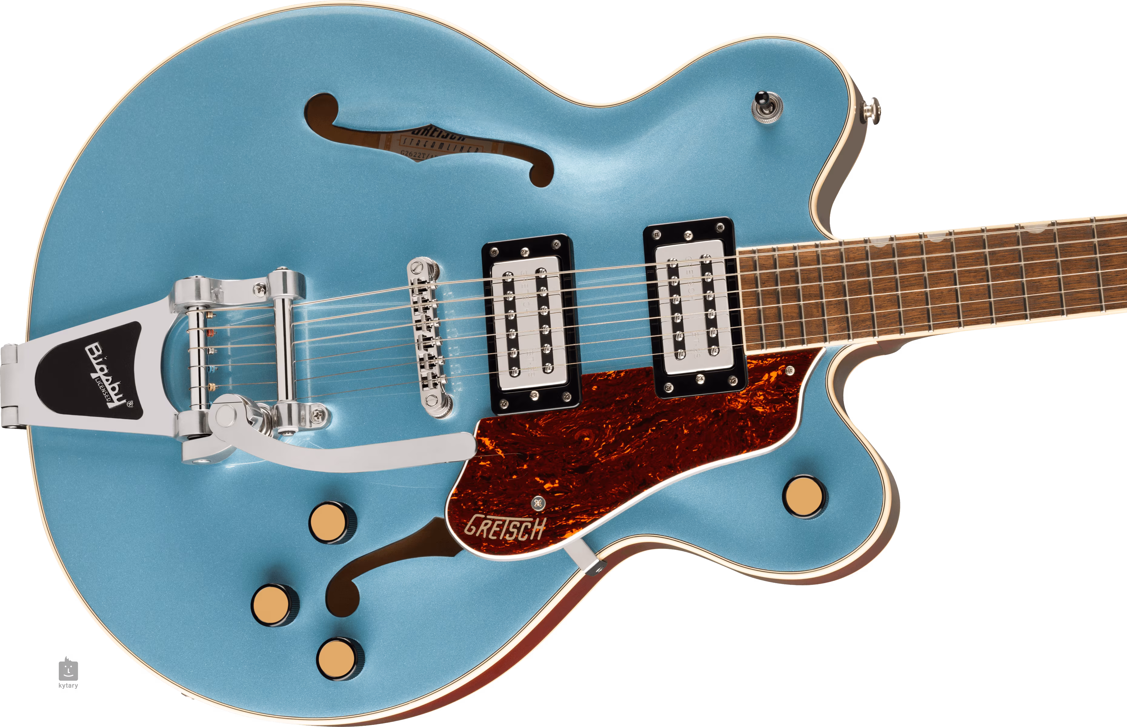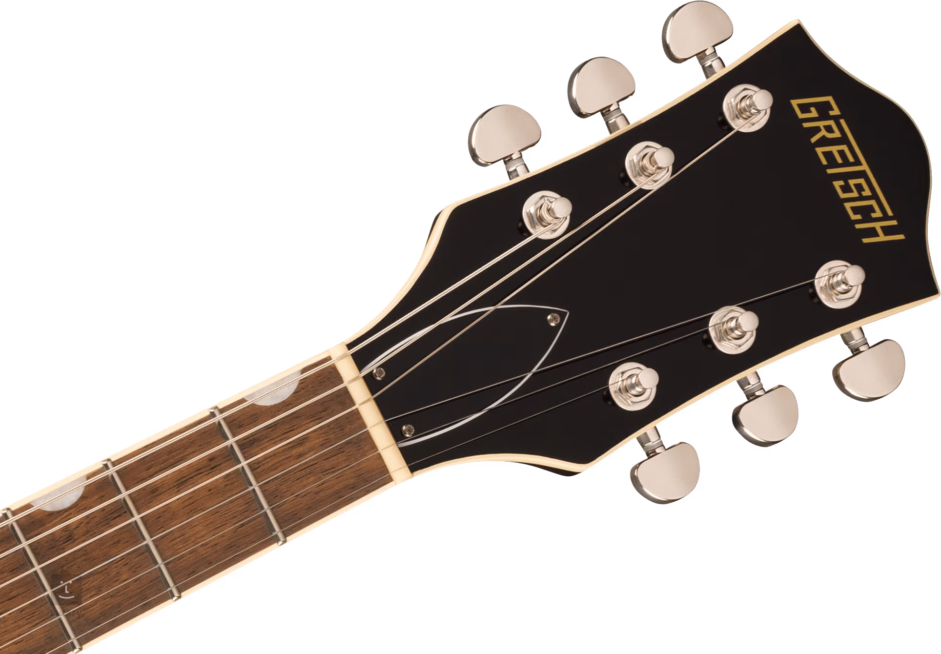 Struny jsou ukotveny přes nultý pražec z kosti ve firemních die-cast mechanikách a přes kobylku Adjusto-Matic v licenčním tremolu Bigsby B70. Klasický oku lahodící design kytar Gretsch podtrhuje řada stylových prvků - od klenuté konstrukce těla s F otvory, elegantní lemovky s jemným nádechem patiny (Aged White), "radio" style potenciometrů, niklového hardware po třívrstvý pickguard z imitace želvoviny se zlatým logem Gretsch.