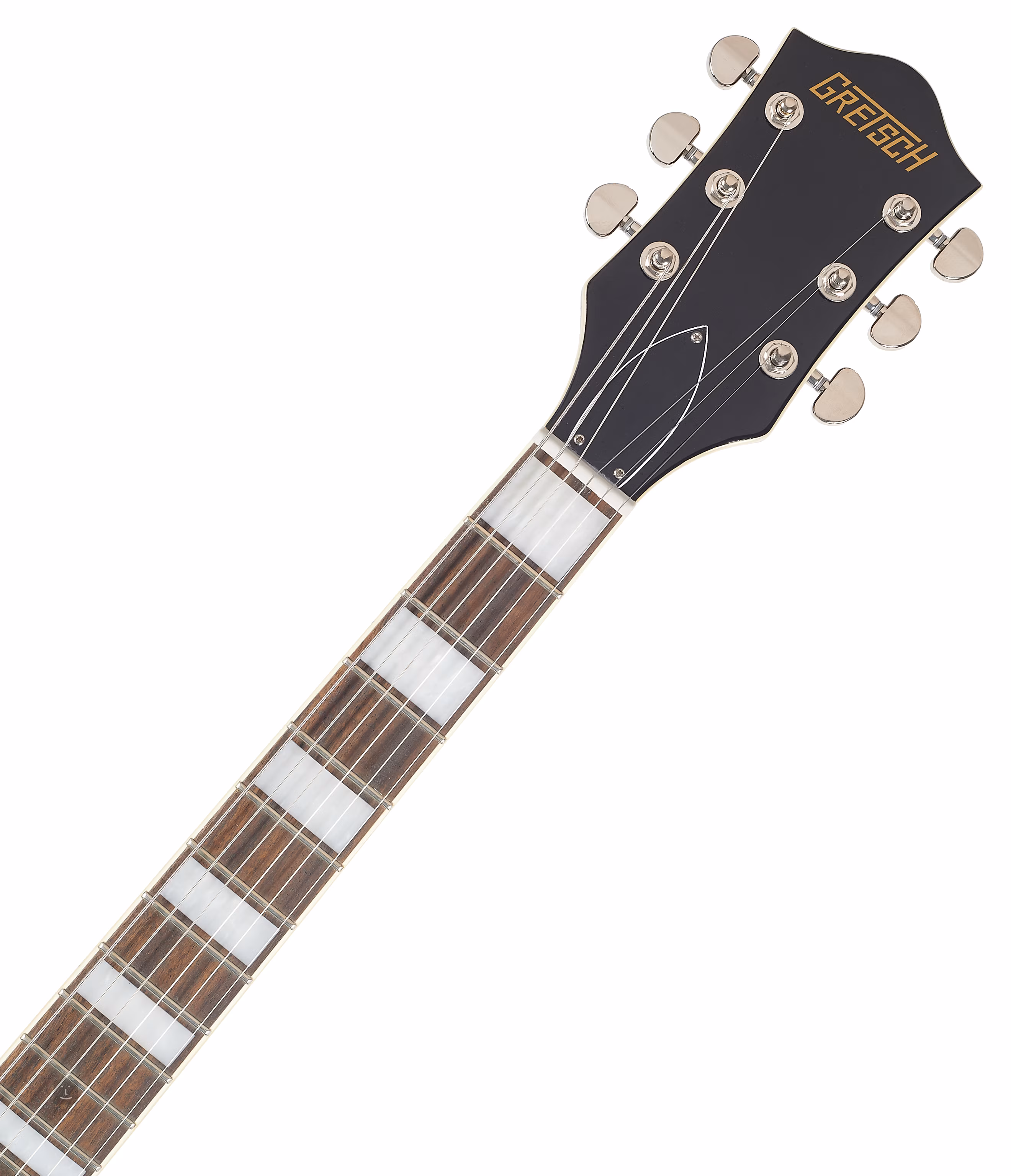 Přesné ladění zaručuje uchycení strun přes nultý pražec z umělé kosti ve firemních Die-Cast ladících mechanikách a v kobylce Adjusto-Matic. Licenčním tremolem Bigsby B70 zpestříte hru decentními zvukovými efekty. Klasický oku lahodící design kytar Gretsch podtrhuje řada stylových prvků - od klenuté konstrukce těla s rozšířenými F otvory pro lepší akustickou projekci, elegantní lemovky s jemným nádechem patiny (Aged White) a černobílé výložky, niklového hardware po černý třívrstvý pickguard.