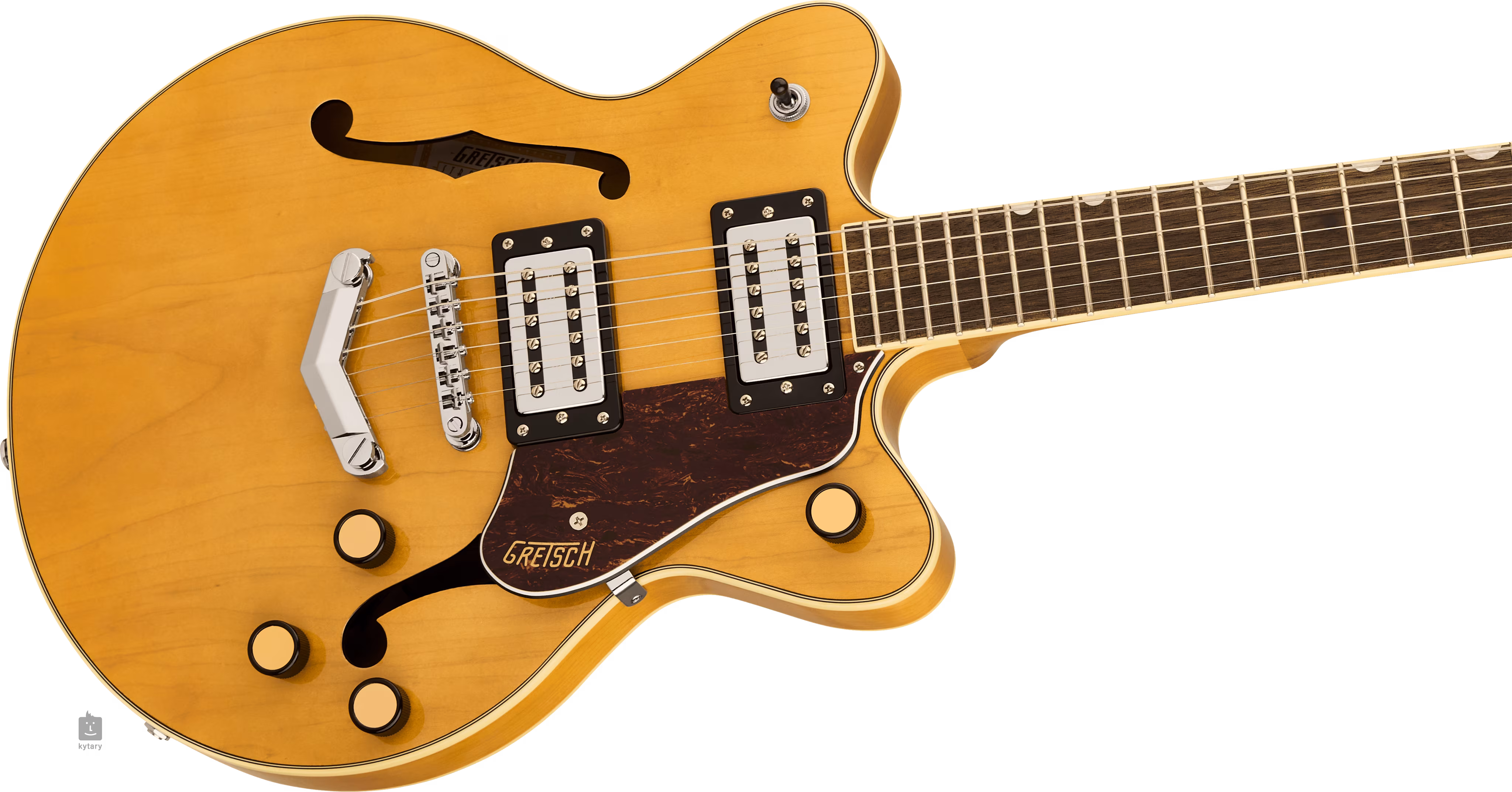 Struny jsou přes nultý pražec z kosti ukotveny ve firemních ladicích die-cast mechanikách a přes kobylku Adjusto-Matic ve struníku (V-Stoptail tailpiece). Klasický oku lahodící design kytar Gretsch podtrhuje řada stylových prvků - od klenuté konstrukce těla s F otvory, elegantní lemovky s jemným nádechem patiny (Aged White), niklového hardware po třívrstvý pickguard z imitace želvoviny se zlatým logem Gretsch.