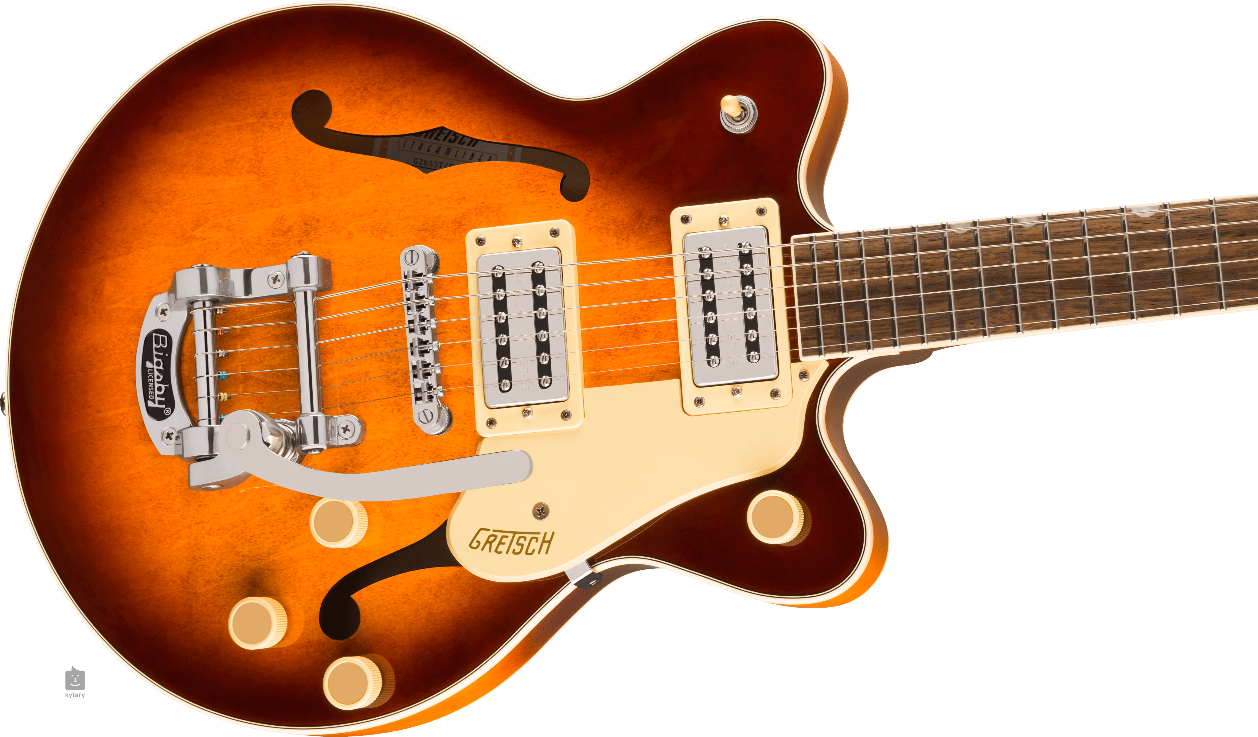 Pololubová kytara G2655T ze série Streamliner jistě potěší hráče, kteří hledají nástroj s moderním zvukem a elegantním designem kytar Gretsch.