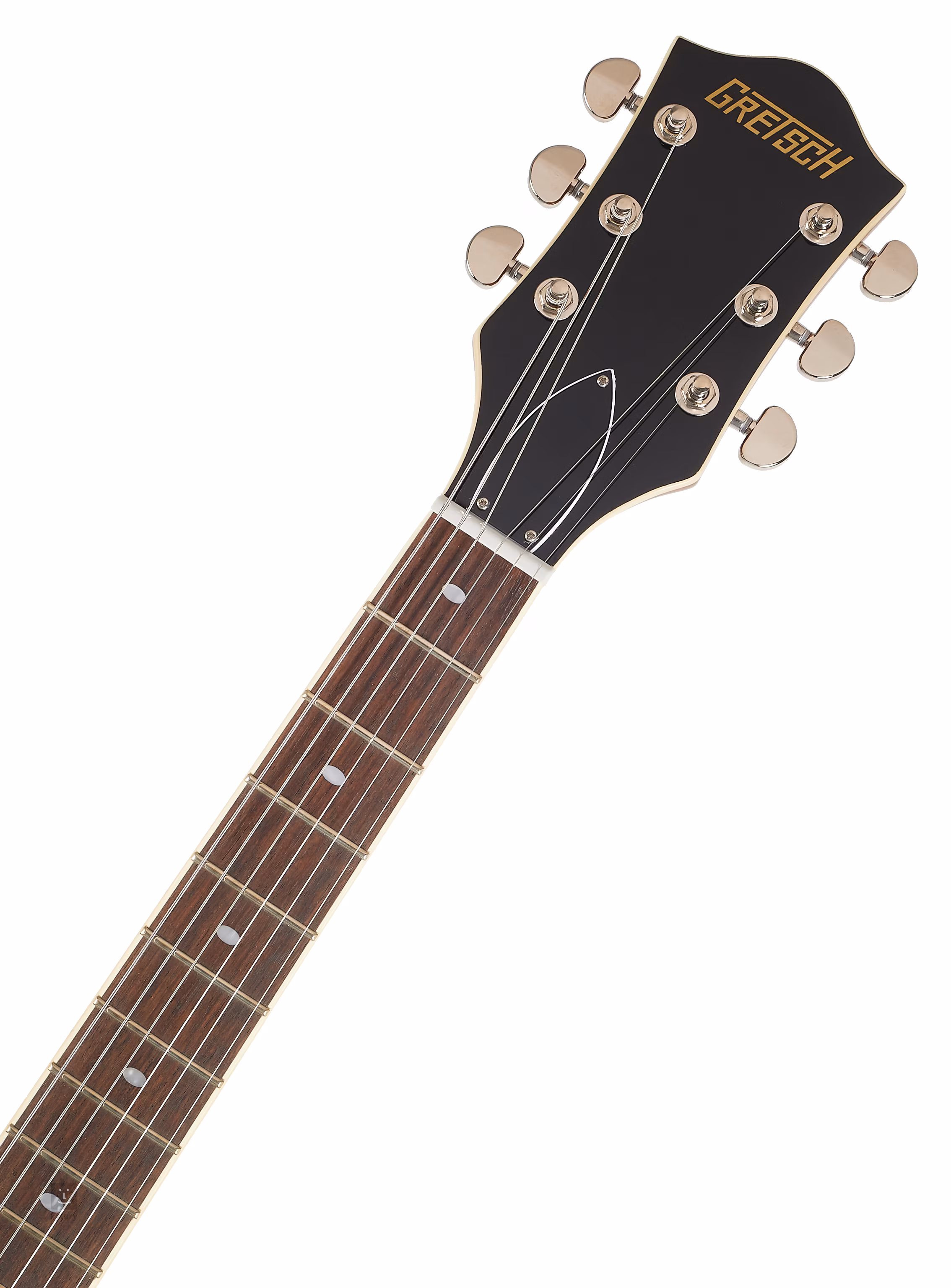 Přesné ladění zaručuje uchycení strun přes nultý pražec z umělé kosti ve firemních Die-Cast ladících mechanikách a kobylce Adjusto-Matic. Licenčním tremolem Bigsby B50 zpestříte hru decentními zvukovými efekty. Klasický oku lahodící design kytar Gretsch podtrhuje řada stylových prvků - od rozšířených F otvorů pro lepší akustickou projekci, stylizovaných rámečků snímačů, elegantní lemovky s jemným nádechem patiny (Aged White) doplněné černobílými linkami, niklového hardware, jednovrstvého pickguardu z imitace želvoviny po působivý finiš.