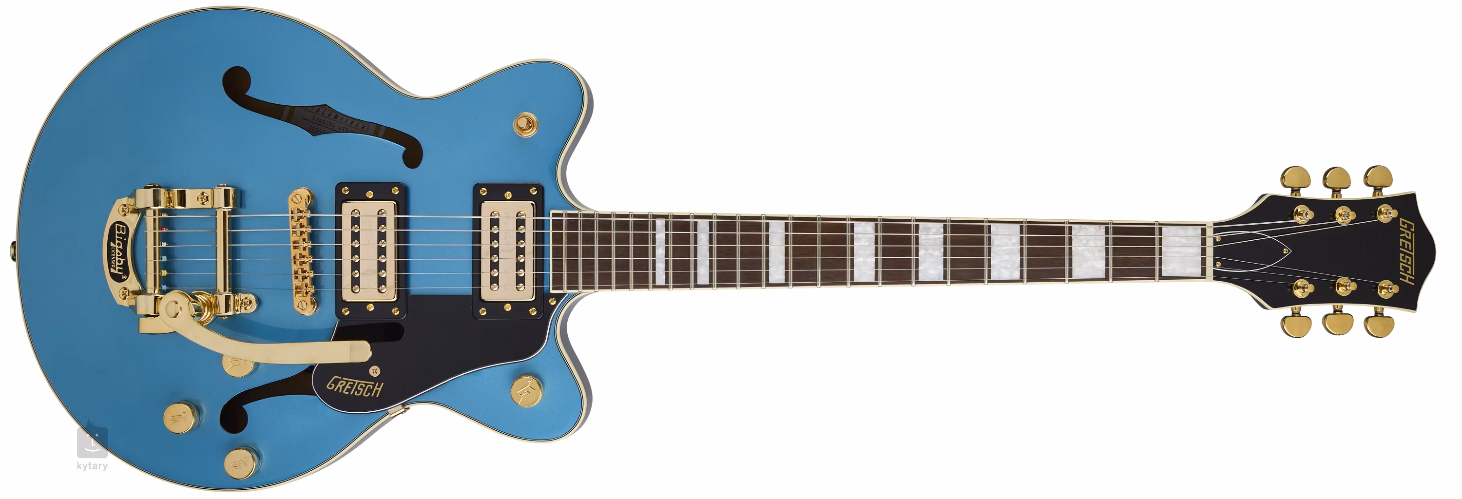 Struny jsou ukotveny přes nultý pražec z kosti ve firemních die-cast mechanikách a přes kobylku Adjusto-Matic v licenčním tremolu Bigsby B50. Klasický oku lahodící design kytar Gretsch podtrhuje řada stylových prvků - od klenuté konstrukce těla s F otvory, elegantní obvodové lemovky, černého pickguardu po hardware ve zlatém provedení.