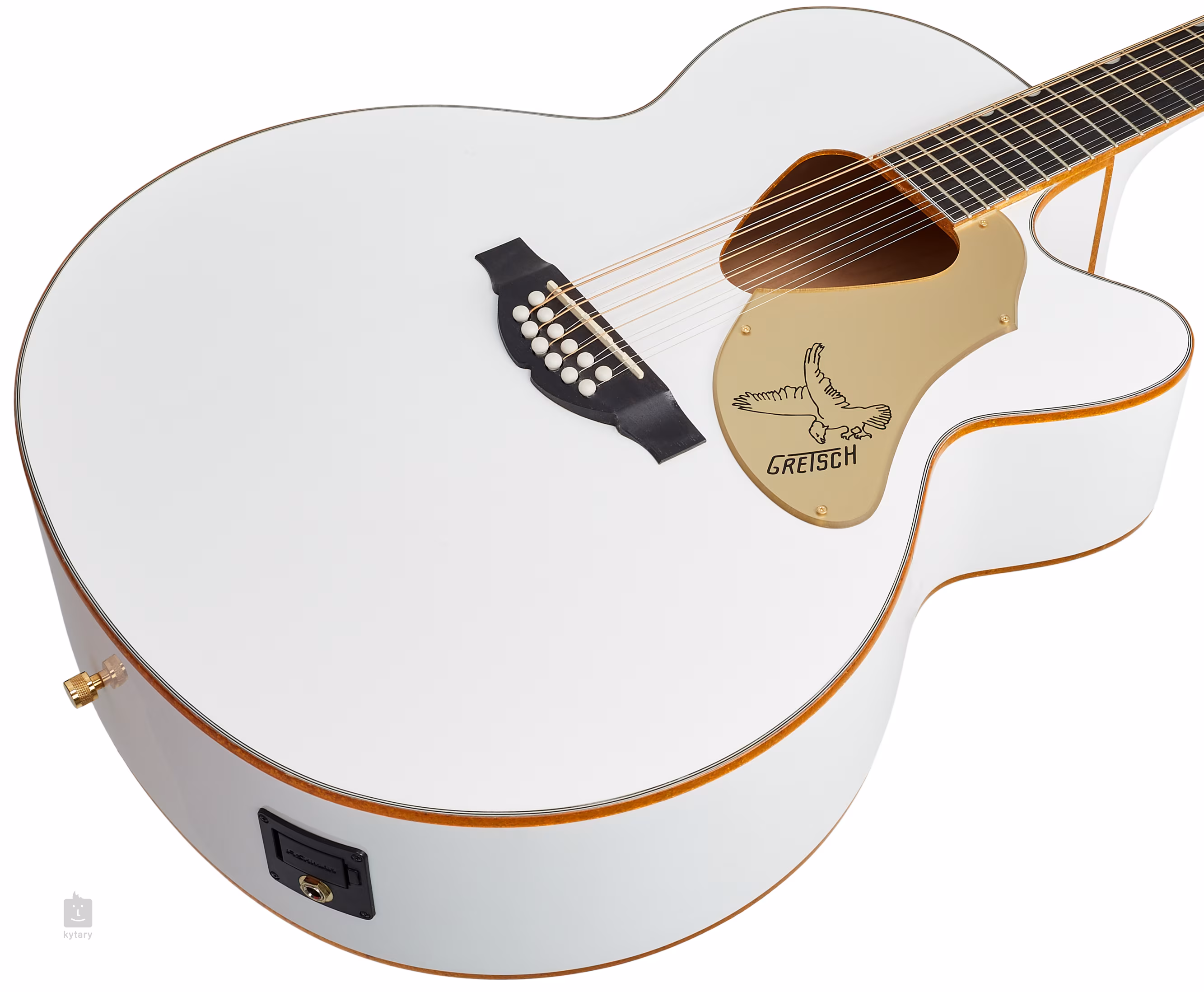 Dvanáctistrunnná elektroakustická kytara G5022CWFE-12 Rancher Falcon WHT s velkým tělem typu Jumbo vám nabídne bohatý plný zvuk dvanáctistrunek a estetiku modelů Gretsch Falcon. Přední deska kytary je zhotovena z masivu smrku, zadní deska a luby jsou vyrobeny z vrstveného javoru. Rezonanci topu podporuje snížené žebrování typu X.