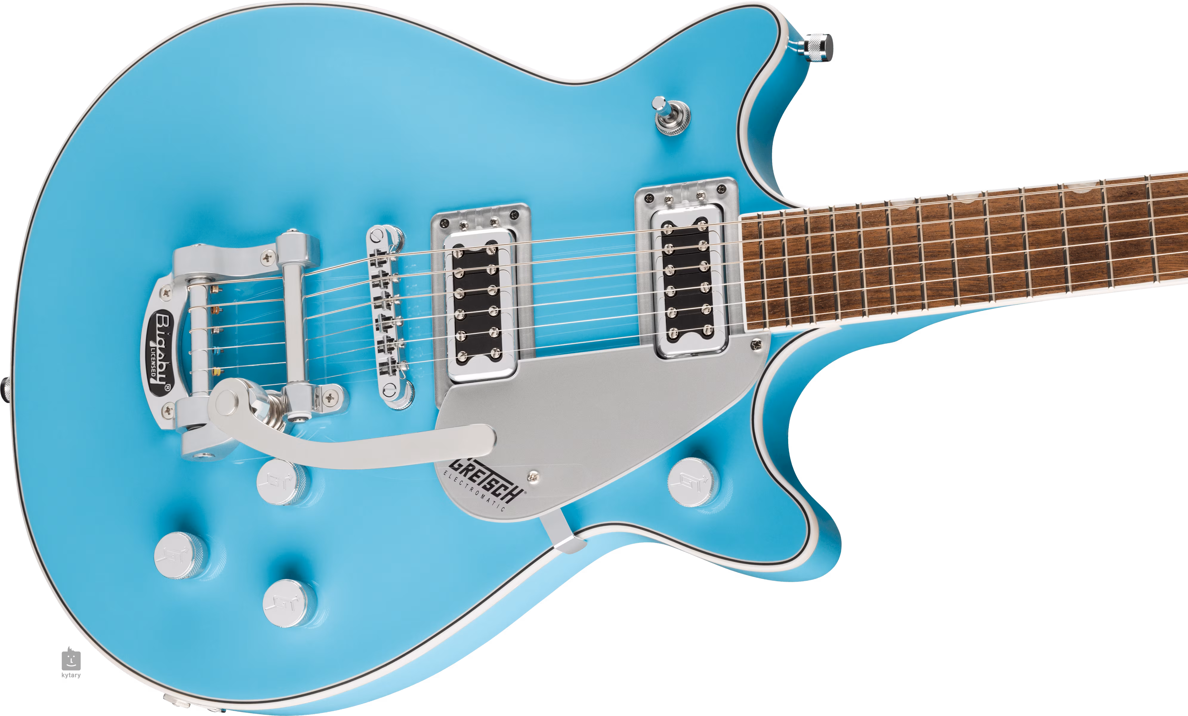 Struny jsou přes nultý pražec z umělé kosti uchyceny ve firemních die-cast ladicích mechanikách a přes nastavitelnou kobylku Adjusto-Matic v licenčním tremolu Bigsby B50. Stylový design nástroje podtrhují tradiční prvky v podobě světlé obvodové lemovky těla doplněné černobílými linkami, chromovaný hardware a Silver Plexi pickguard s černým firemním logem Gretsch.