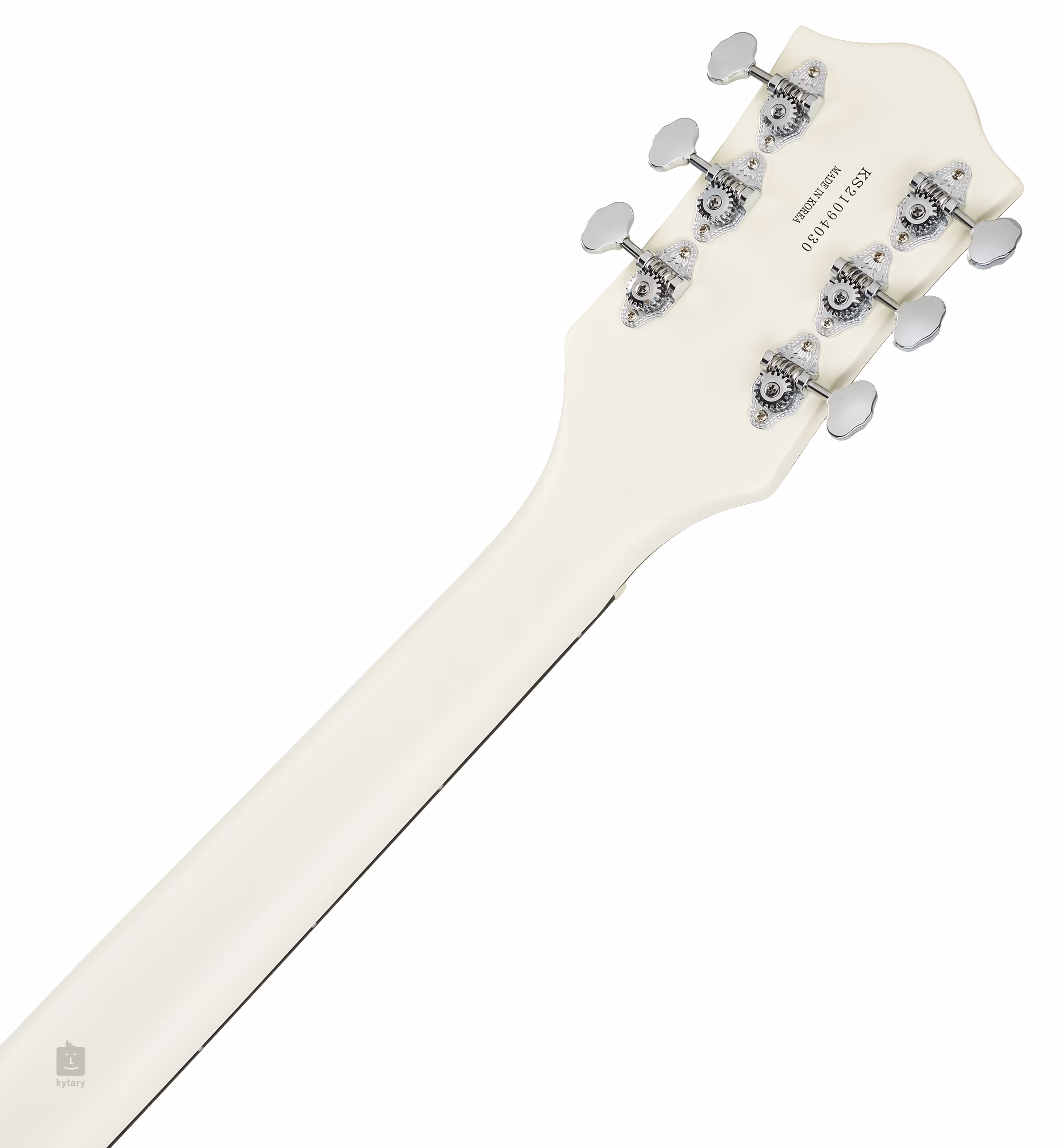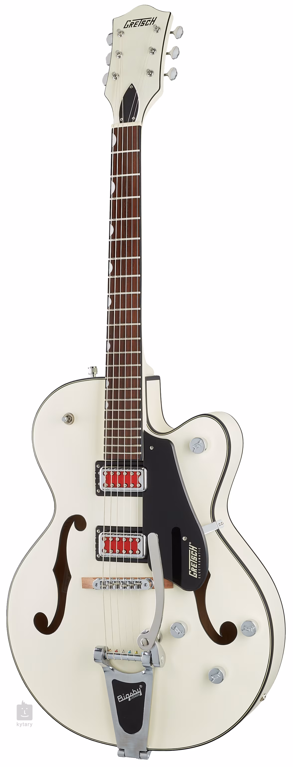 Přesné ladění zaručuje uchycení strun přes nultý pražec z materiálu NuBone ve firemních otevřených ladících mechanikách ve Vintage stylu a v kobylce Adjusto-Matic usazené na pevné dřevěné základně. Licenčním tremolem Bigsby B60 zpestříte hru decentními zvukovými efekty. Klasický oku lahodící design kytar Gretsch podtrhuje řada stylových prvků - od klenuté konstrukce těla s rozšířenými F otvory pro lepší akustickou projekci, elegantní černé lemovky a černobílé výložky, menší hlavice kytary v pozdním 50s´ stylu, chromovaného hardware po černý Plexi pickguard ozdobený firemním logem Gretsch.