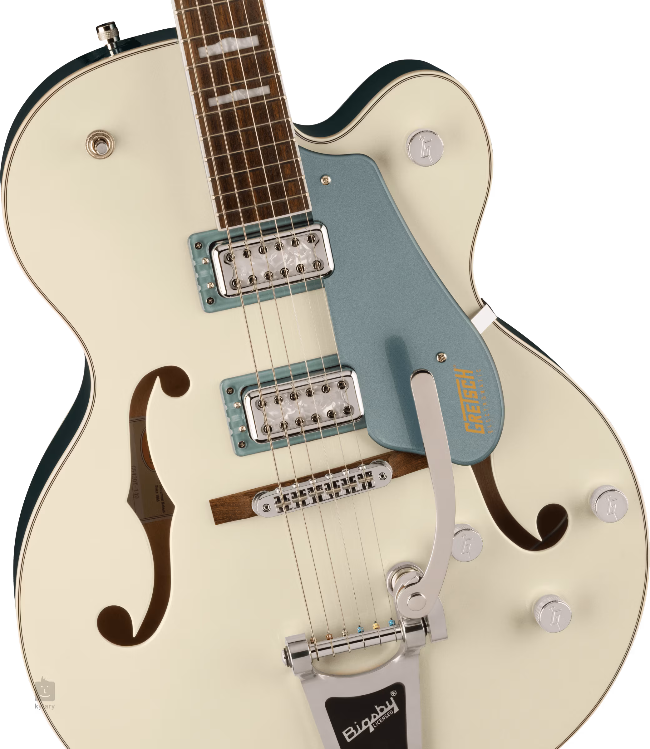 Lubová kytara Gretsch G5420T-140 EMTC 140TH SC HLW z řady Electromatic je součástí speciální edice 140th Anniversary uvedené na trh k příležitosti 140 let od založení značky (1883). Nabízí tělo v single-cut designu zhotovené z laminovaného javoru. K javorovému krku s profilem Classic „C“ je přilepen hmatník z fíkovníku osazený dvaadvaceti pražci velikosti Medium Jumbo. Orientaci po jeho ploše usnadňují polohové bloky z imitace perleti.