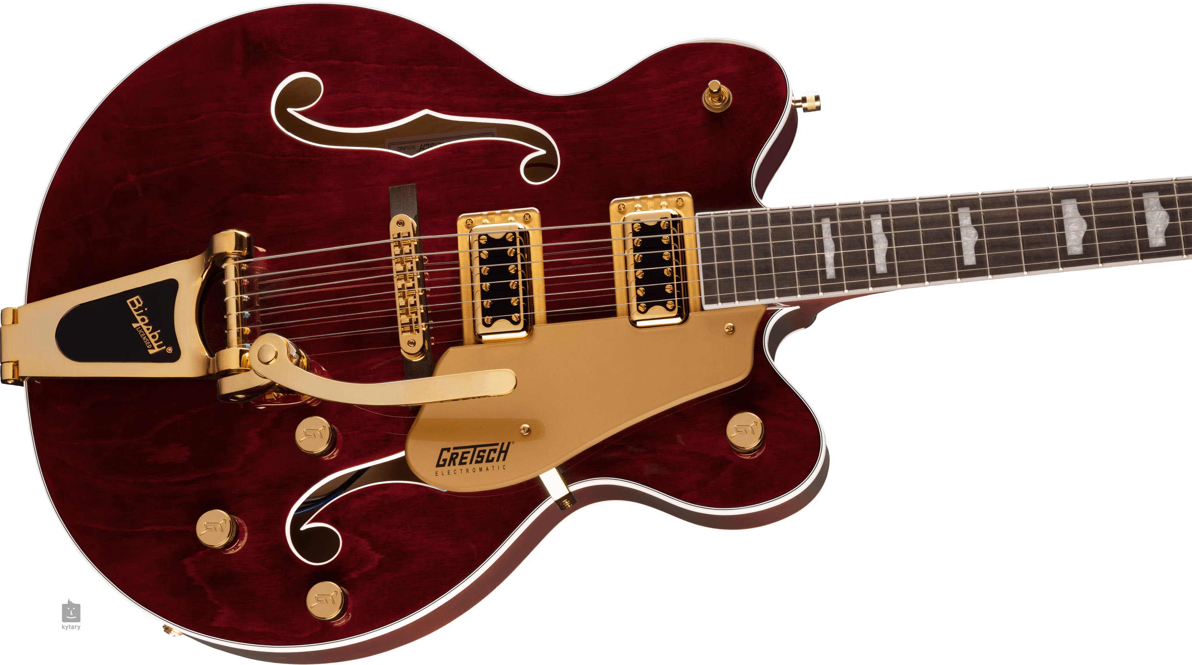 Struny jsou ukotveny přes nultý pražec z materiálu Graph Tech NuBone v otevřených ladicích mechanikách ve vintage stylu a přes kobylku Adjusto-Matic usazenou na dřevěné základně v licenčním tremolu Bigsby B60. Stylový design kytary podtrhuje barevná úprava Walnut Stain, lemovka těla a hlavice a hardware v luxusním zlatém provedení včetně pickguardu, tremola nebo krytů a rámečků snímačů.