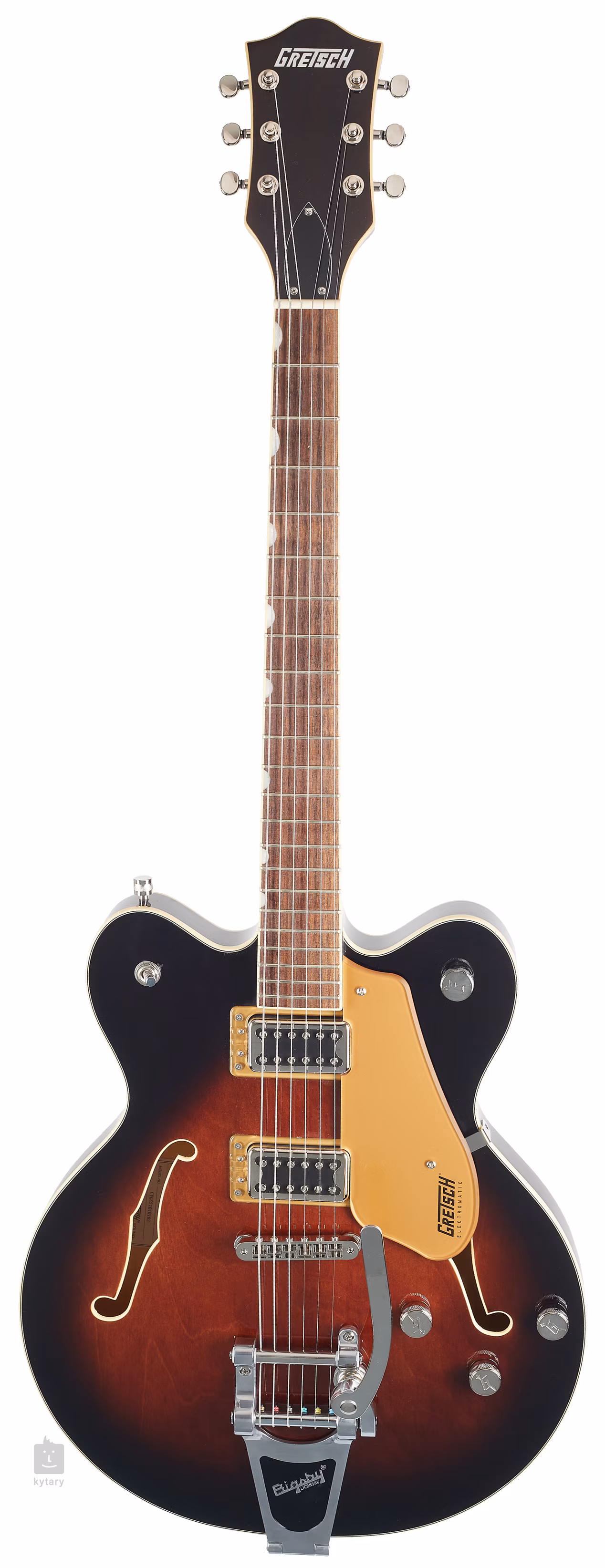 Přesné ladění zaručuje uchycení strun přes nultý pražec z materiálu Graph Tech NuBone ve firemních Die-Cast ladících mechanikách a přes kobylku Adjusto-Matic v licenčním Bigsby B70 tremolu. Stylový design kytary podtrhují tradiční prvky v podobě obvodové lemovky těla v provedení Aged White, niklového hardware nebo Gold Plexi pickguardu s černým firemním logem Gretsch.
