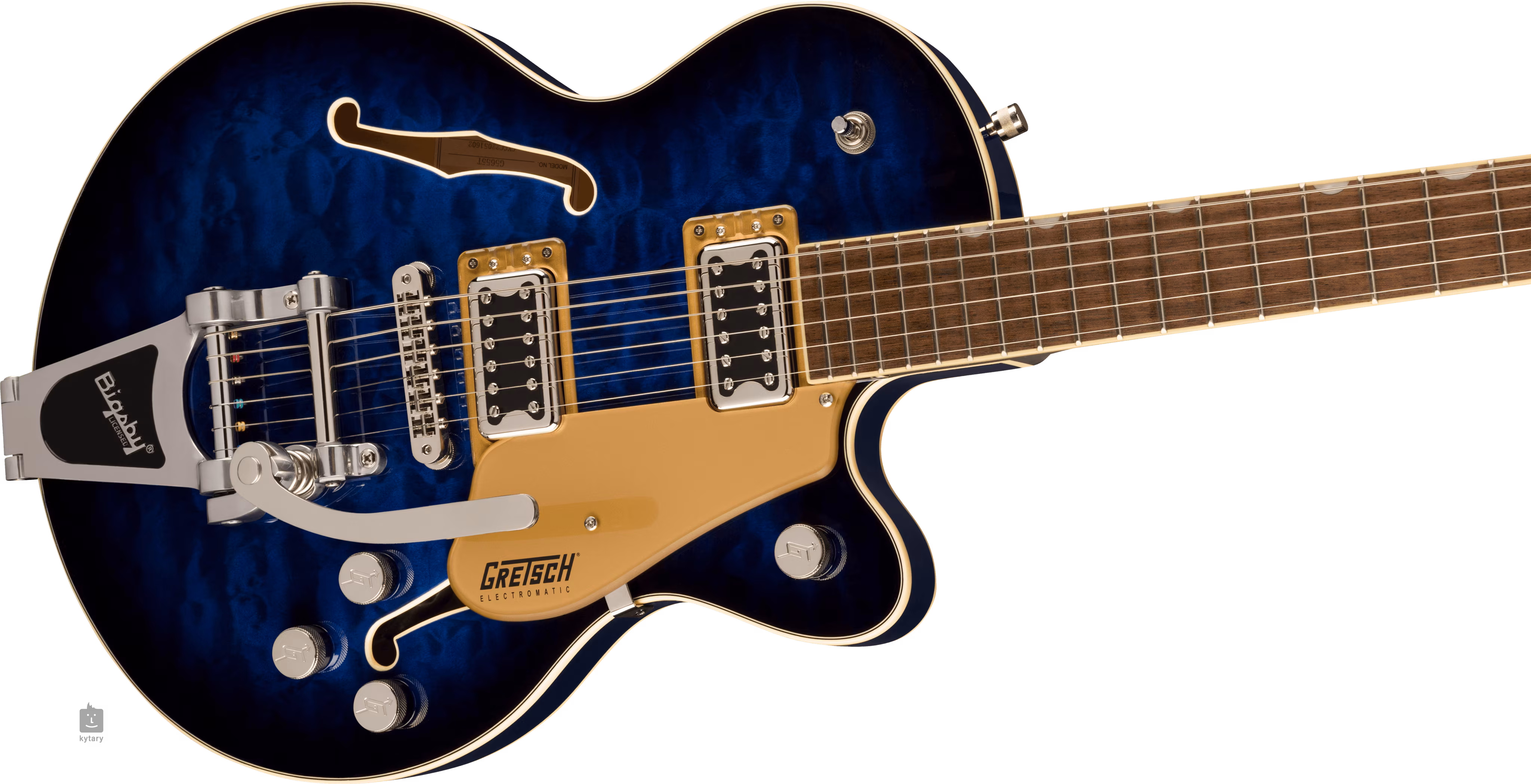 Kompaktnější čtrnáctipalcové tělo pololubového single-cut modelu G5655T-QM Electromatic HDS je zhotoveno z efektního vrstveného obláčkového javoru (quilted maple). Komorovaný smrkový středový blok vyztužuje přední desku kytary a snižuje náchylnost nástroje na nežádoucí “vazbení”. K javorovému krku s profilem Thin „U“ je přilepen hmatník z fíkovníku osazený dvaadvaceti pražci velikosti Medium Jumbo. Orientaci na hmatníku usnadňují offset polohové značky z imitace perleti (Neo-Classical Thumbnail).