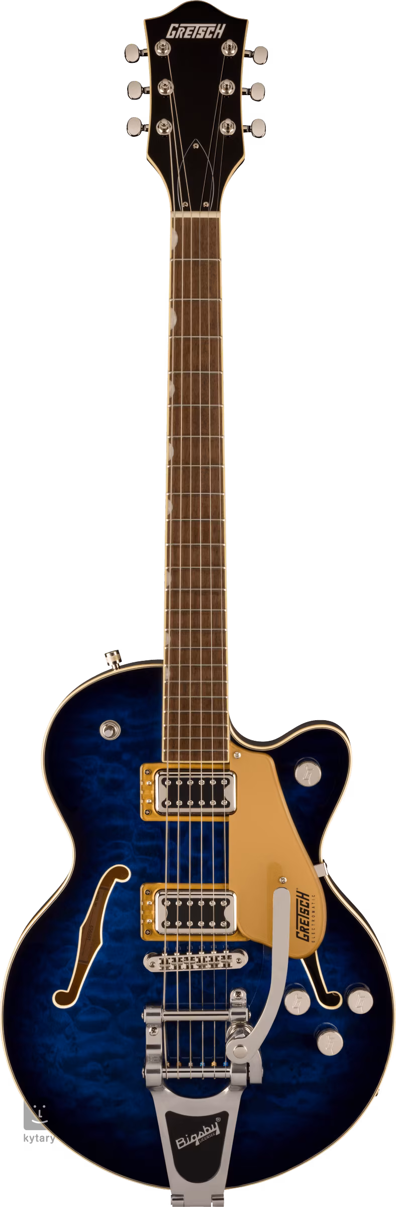 Přesné ladění zaručuje uchycení strun přes nultý pražec z materiálu Graphtech NuBone ve firemních die-cast mechanikách a v kobylce Adjusto-Matic. Licenčním tremolem Bigsby B70 zpestříte hru zvukovými efekty. Stylový design kytary podtrhují tradiční prvky v podobě obvodové lemovky těla v provedení Aged White, niklového hardware nebo Gold Plexi pickguardu s černým firemním logem Gretsch.