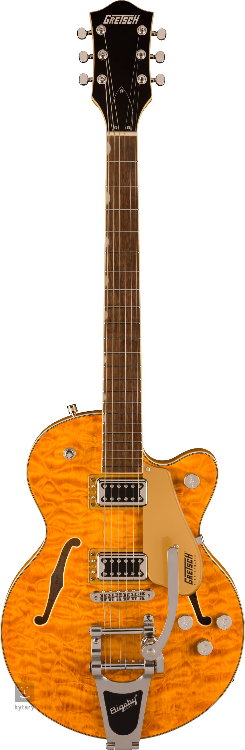 Přesné ladění zaručuje uchycení strun přes nultý pražec z materiálu Graphtech NuBone ve firemních die-cast mechanikách a v kobylce Adjusto-Matic. Licenčním tremolem Bigsby B70 zpestříte hru zvukovými efekty. Stylový design kytary podtrhují tradiční prvky v podobě obvodové lemovky těla v provedení Aged White, niklového hardware nebo Gold Plexi pickguardu s černým firemním logem Gretsch.