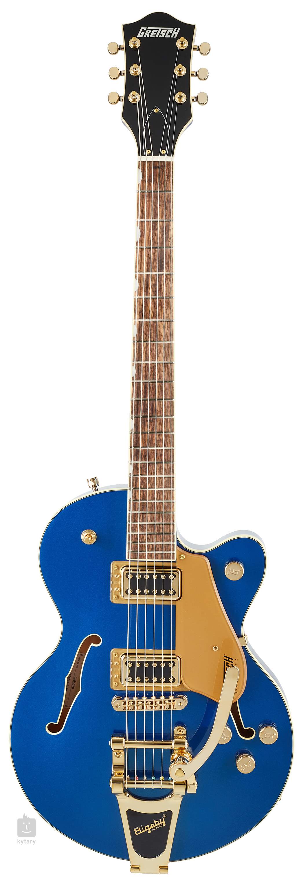 Přesné ladění zaručuje uchycení strun přes nultý pražec z materiálu Graphtech NuBone ve firemních die-cast mechanikách a v kobylce Adjusto-Matic. Licenčním tremolem Bigsby B70 zpestříte hru zvukovými efekty. Klasický oku lahodící design kytar Gretsch podtrhuje řada stylových prvků - klenutá konstrukce těla, elegantní lemovka s jemným nádechem patiny (Aged White), černobílá výložka, hardware ve zlatém provedení a Gold Plexi pickguard ozdobený černým firemním logem Gretsch.