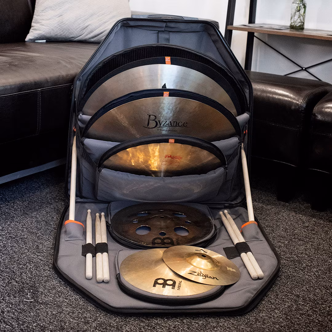 Tato nová souprava obalů od značky Gruvgear s revolučním designem určitě usnadní život nejednomu bubeníkovi. Hybridní obaly Veloc v sobě kombinují odolnost pevných obalů, přičemž si stále udržují nízkou hmotnost. Vyrobeny jsou z voděodolné textilie 1680D a z jednu stranu mají z pevného ABS/polykarbonátového plastu. Výhodou je, že se dají pomocí magnetického systému jednoduše přichytit na přepravní vozík, takže celou soupravu, včetně hardwaru, můžete bezpečně a pohodlně převézt najednou. Díky jejich speciálnímu patentovanému designu je také možné celou sadu složit/rozložit bez toho, abyste museli obaly z vozíku sundávat. Samozřejmostí jsou polstrované rukojetě, velice kvalitní zipy, nebo u většich obalů také odnímatelné polstrování. Veloc také přichází s bezpečnostním systémem – každý obal má v sobě speciální „Global Recovery Tag,“ tedy štítek s unikátním sériovým číslem, který se dá rozpoznat na více než 2800 celosvětových letištích. V případě ztráty je tak velice jednoduché se dostat zpátky ke svým věcem. Tento obal v sobě ukrývá 5 kapes na činely různých velikostí (až do 24") a disponuje odnímatelnými kolečky a výsuvnou rukojetí.