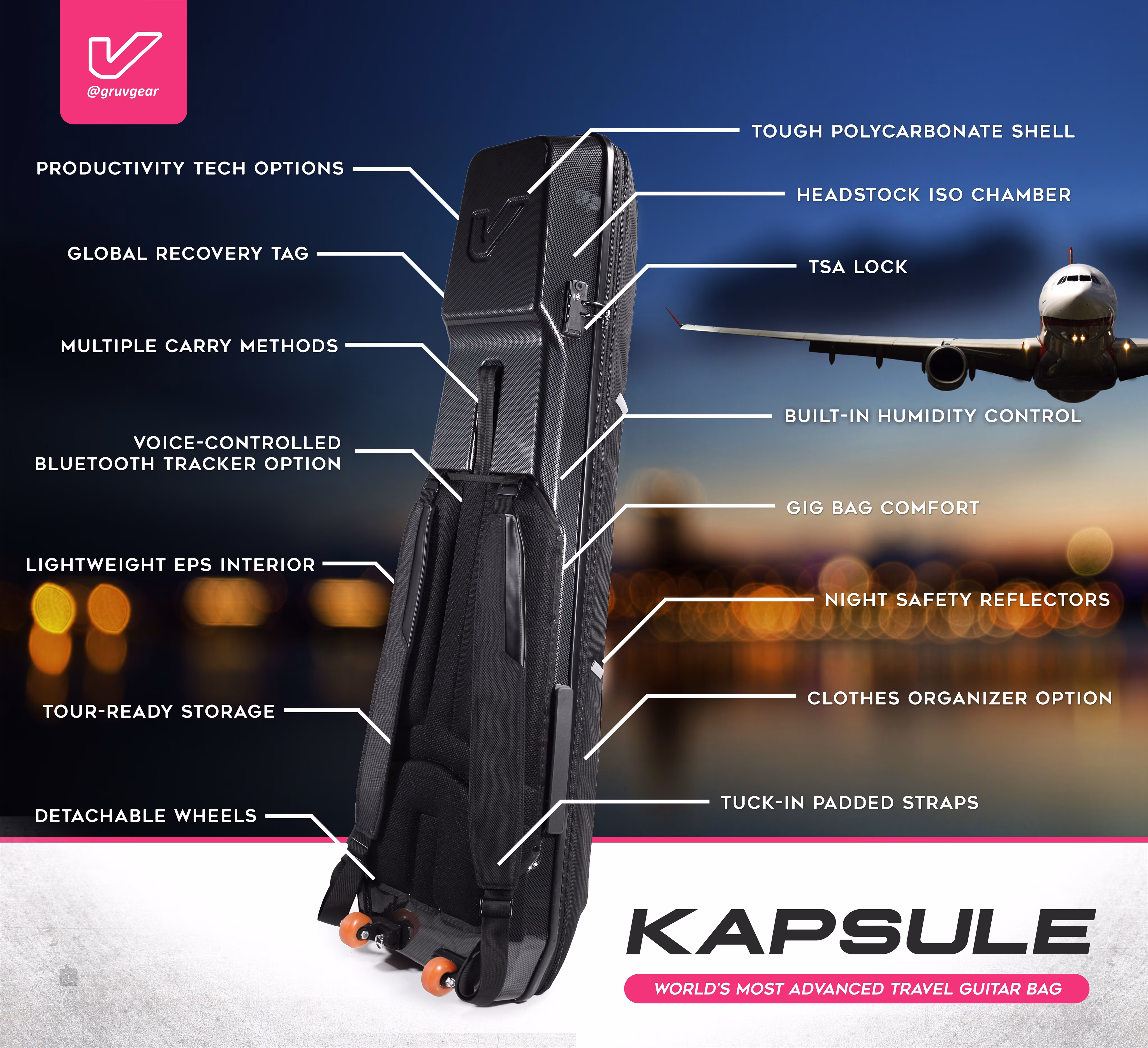 Kapsule je unikátní a revoluční obal pro akustické a elektrické strunné nástroje od firmy Gruv Gear a nabízí maximální pohodlí pro váš nástroj a drobné příslušenství. Je vhodný především pro muzikanty na cestách, kteří vyžadují maximální bezpečí pro svůj nástroj, ale zároveň se nechtějí ztrhat jeho nošením. Konstrukce obalu tvoří kombinace odolného polykarbonátu a ABS plastu, interiér je potom vyplněn měkkou EPS pěnou, která se automaticky odvětrává, skvěle ochrání váš nástroj a dokonale absorbuje vnější otřesy či nárazy. Snadný transport vám potom zaručí odolná kolečka, robustní zádové popruhy s měkkým polstrováním a pár ručních madel.
