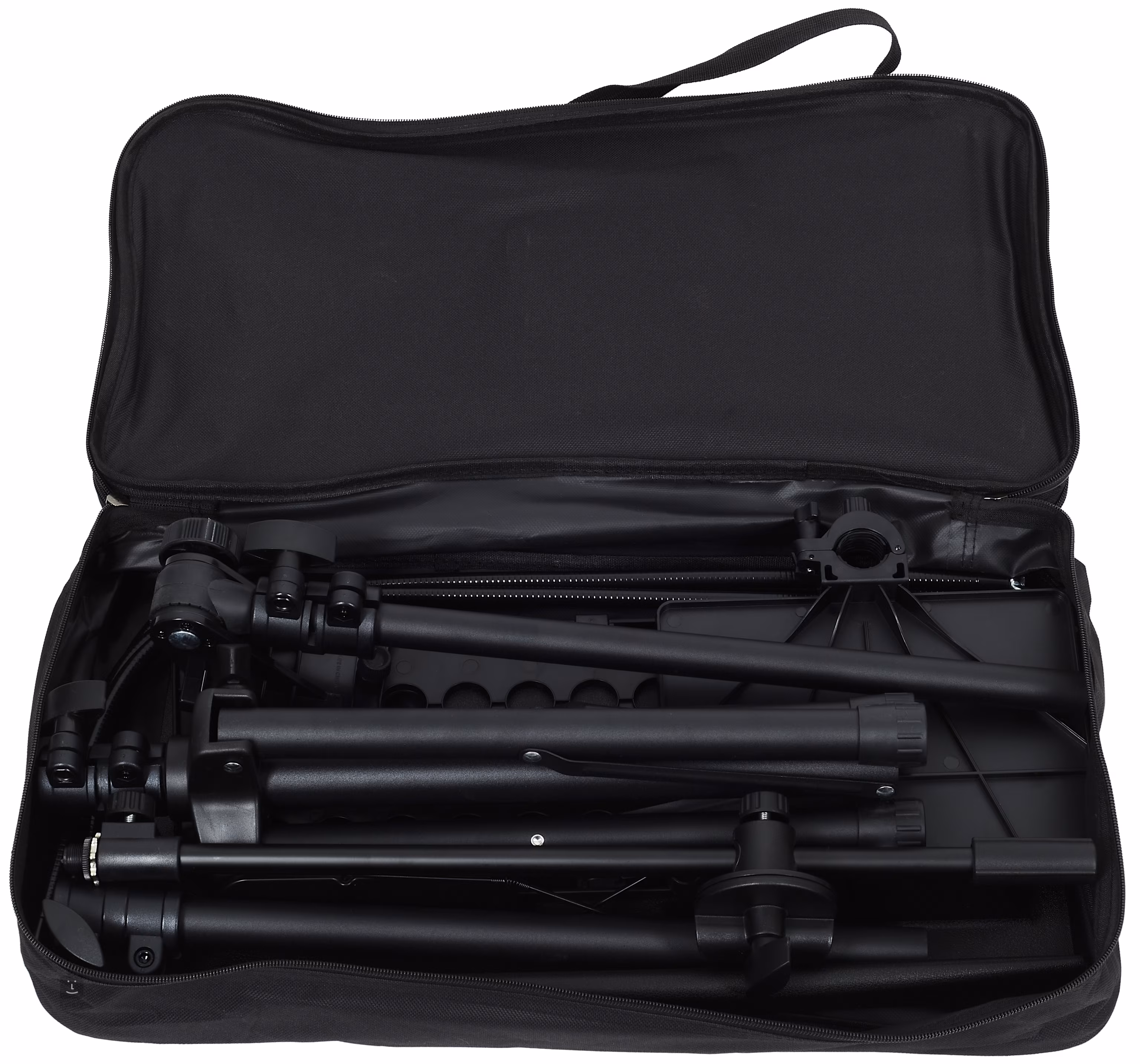 GMS-01 Live Streaming Mic Stand je víceúčelový mikrofonní stojan se stabilní základnou na trojnožce, nastavitelnou výškou, držáky na tři telefony pro živé streamování až na třech platformách současně, ztlumitelným osvícením v podobě desetipalcového prstence, notovým pultem a praktickou základnou/pultem pro odkládání předmětů, nápojů apod.