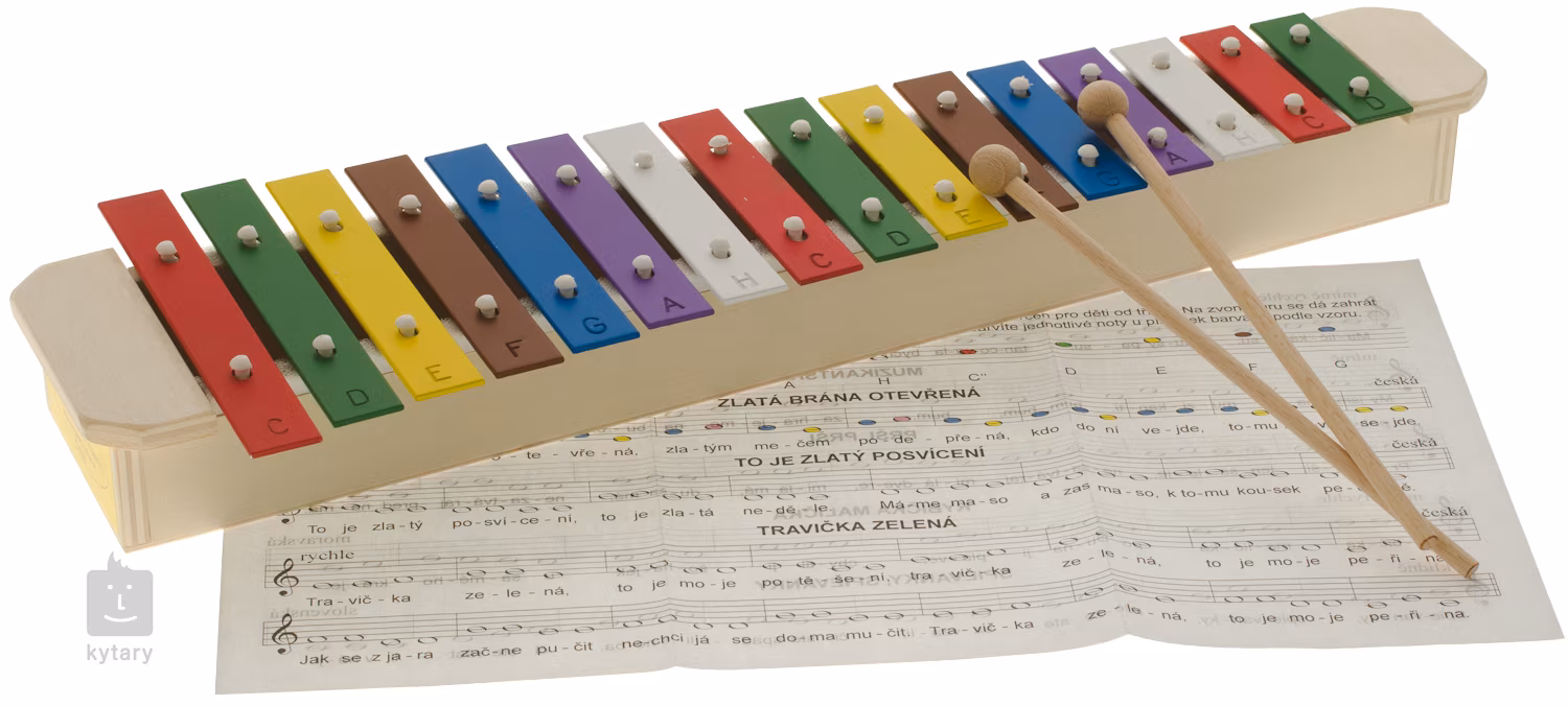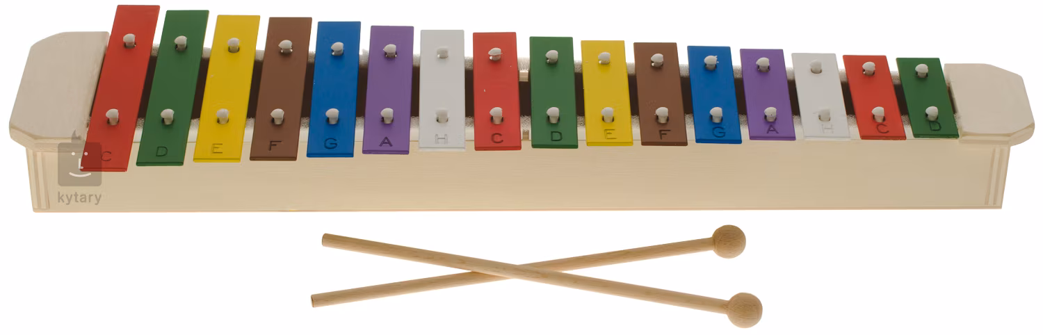 Dětská sopránová zvonkohra. 16 kamenů šířky 20 mm (pořadí barev evropské). Součástí dodávky jsou 2 paličky.