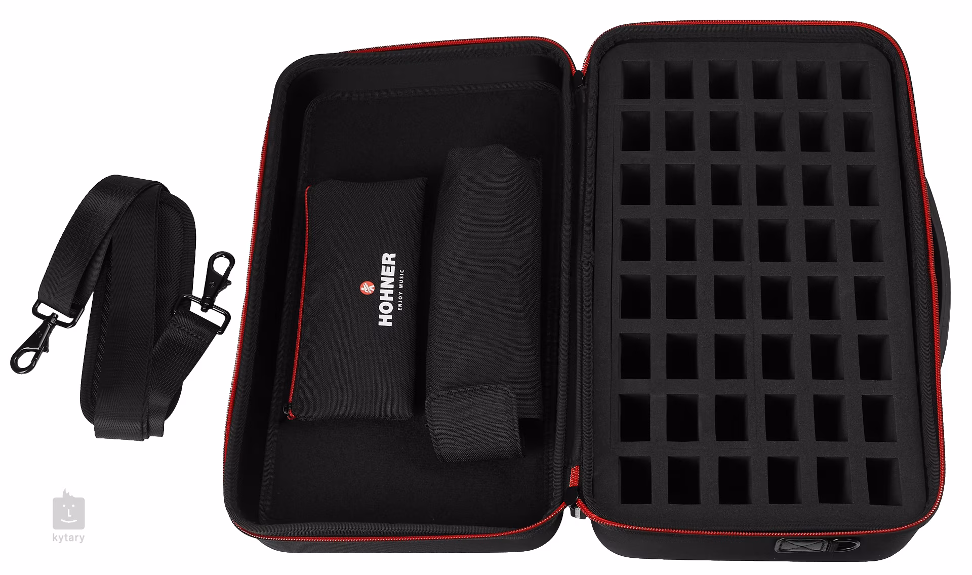 Úložný prostor pouzdra FlexCase XL nabízí maximální flexibilitu v rámci možných sestav uskladněných harmonik - bezpečně pojme buď 48 diatonických harmonik, 30 diatonických harmonik plus dvě dvanáctikanálkové chromatické harmoniky nebo 30 diatonických harmonik a jednu šestnáctikanálkovou chromatiku. V závislosti na konfiguraci, tj. pokud nevyužijte maximální počet slotů, nabízí i úložný prostor pro zpěvový mikrofon a drobné příslušenství včetně nářadí. Vertikální uskladnění harmonik poskytuje uživatelům okamžitý přehled, kde se nachází nástroj v požadovaném ladění. Každý úložný prostor/slot odděluje pěnová vycpávka, která zabraňuje poškrábání a jinému poškození harmonik. K pouzdru je páskou Velcro (suchým zipem) přichycen obal na nářadí a obal na chromatickou harmoniku (případně na uložení odnímatelného popruhu na rameno). Bezproblémovou a bezpečnou manipulaci s pouzdrem zaručuje zapínání na zip a madlo nebo odnímatelný popruh na rameno pro snadný transport.
