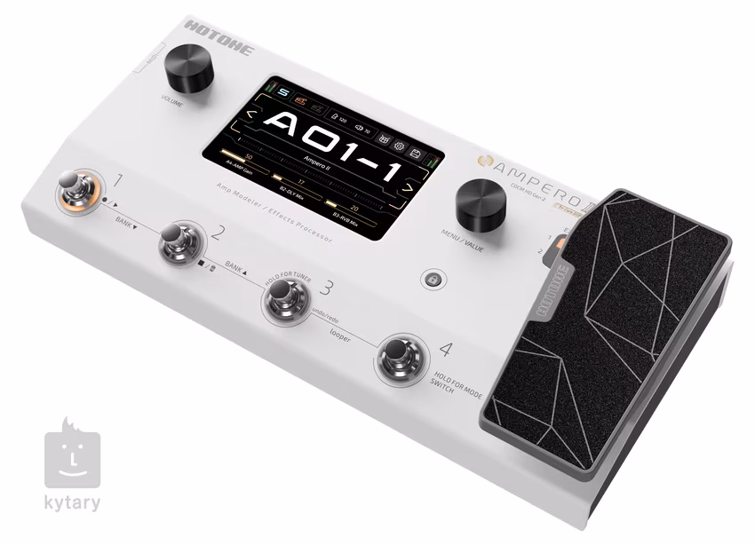 Zvuková knihovna Ampero II je nadupaná více než 460 efekty, mezi nimiž najdete přes stovku legendárních kytarových pedálů, více než 60 originálních efektů z dílny Hotone, přes devadesát modelů zesilovačů, 68 simulací reproboxů, řadu předzesilovačů, mikrofonních simulací, apod. Nechybí ani 20 továrních IR reproboxů Celestion a 50 slotů pro uživatelské IR. Svá oblíbená nastavení si můžete uložit do 300 presetů (rozdělených do 75 bank po čtyřech) a poté mezi nimi libovolně přepínat pomocí čtyř footswitchů. Zařízení funguje ve dvou režimech – režim Patch Mode slouží právě k vyvolávání presetů a jejich přepínání, zatímco režim Stomp Mode umožňuje standardnější ovládání, v němž si pohodlně vytvoříte efektový řetězec a upravíte jednotlivé parametry. Aby toho nebylo málo, multiefekt obsahuje stereo looper s maximální kapacitou 60 sekund nahrávacího času a samozřejmě také integrovanou ladičku.