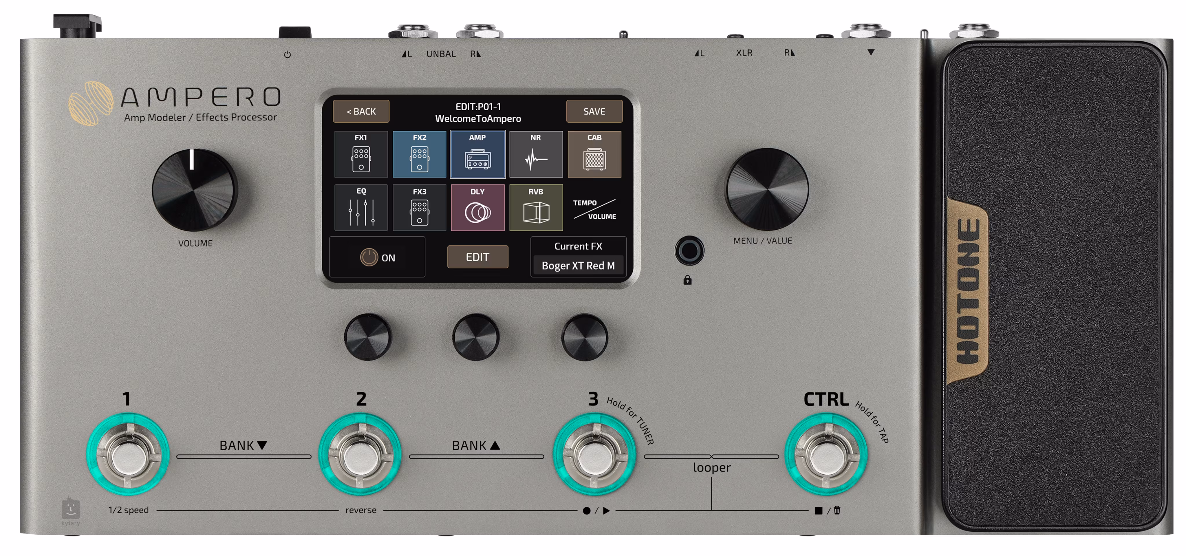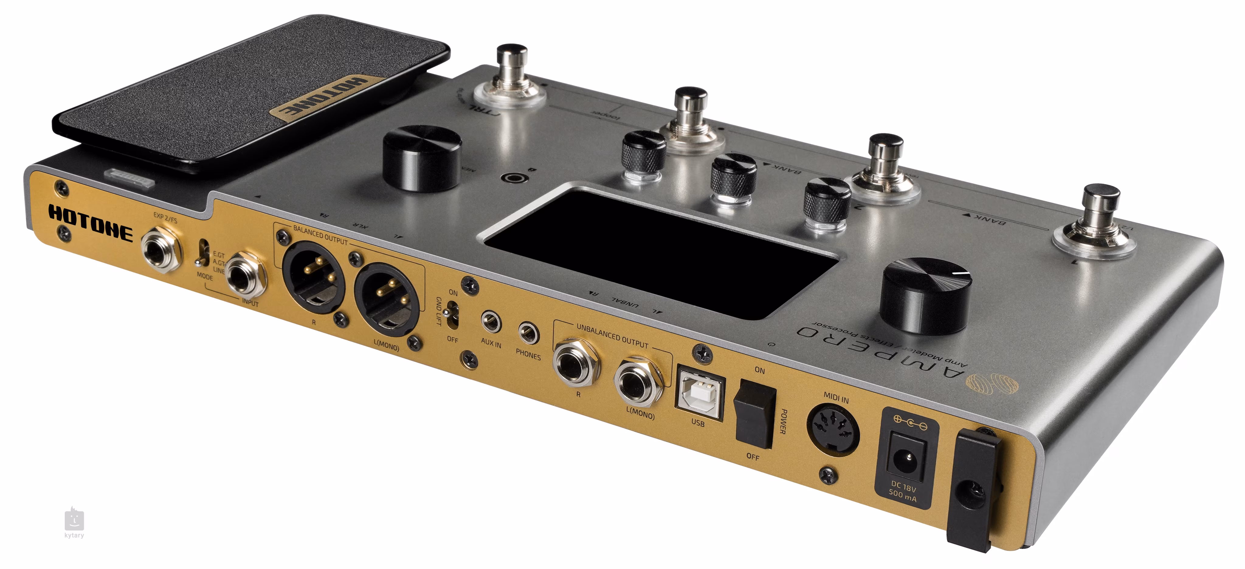 Ampero je kytarový multiefekt z produkce asijské značky Hotone, který s přehledem dokáže nahradit celý kytarový rig. Nabízí 242 kytarových efektů z databáze XTOMP (64 modulací aparátů, 60 simulací kabinetů, více než 100 zvuků známých pedálových efektů, původní designy Hotone, simulace zvuků akustických kytar a simulace mikrofonů a jejich nastavení), 198 presetů (99 továrních, 99 uživatelských), zabudovaný bicí automat se stovkou rytmických patternů, looper s kapacitou 100 sekund nahrávacího času v monu (50 ve stereu) a integrovaný expression pedál. Díky třípolohovému přepínači electric/acoustic/FX vstupního signálu lze multiefekt používat nejen s elektrickými kytarami a baskytarami, ale i elektroakustickými kytarami nebo klávesovými nástroji.