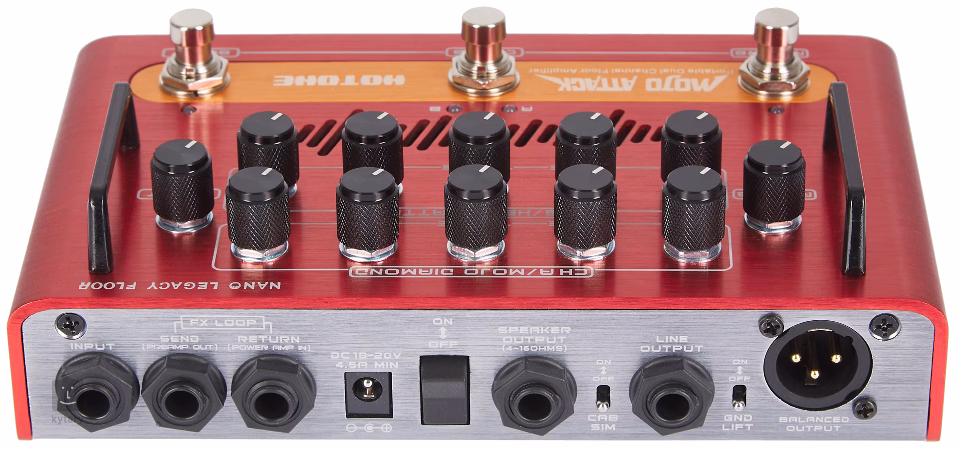 Mojo Attack je kytarový tranzistorový zesilovač s výkonem 75W ve formě pedálového efektu, který nabízí praktické řešení všem hráčům, co se rádi obejdou bez nutnosti tahat s sebou tradiční rozměrné a těžké kytarové zesilovače. Jedná se o dvoukanálový aparát postavených na zvucích dvou mikro zesilovačů Hotone z řady Nano Legacy – Mojo Diamond inspirovaného zesilovači Fender z „tvídového“ období a Mojo Heart Attack inspirovaného hi-gain tlakem aparátu Mesa Boogie Rectifier. Mojo Attack tak respektuje klasické rozdělení na clean/crunch a distortion kanál.