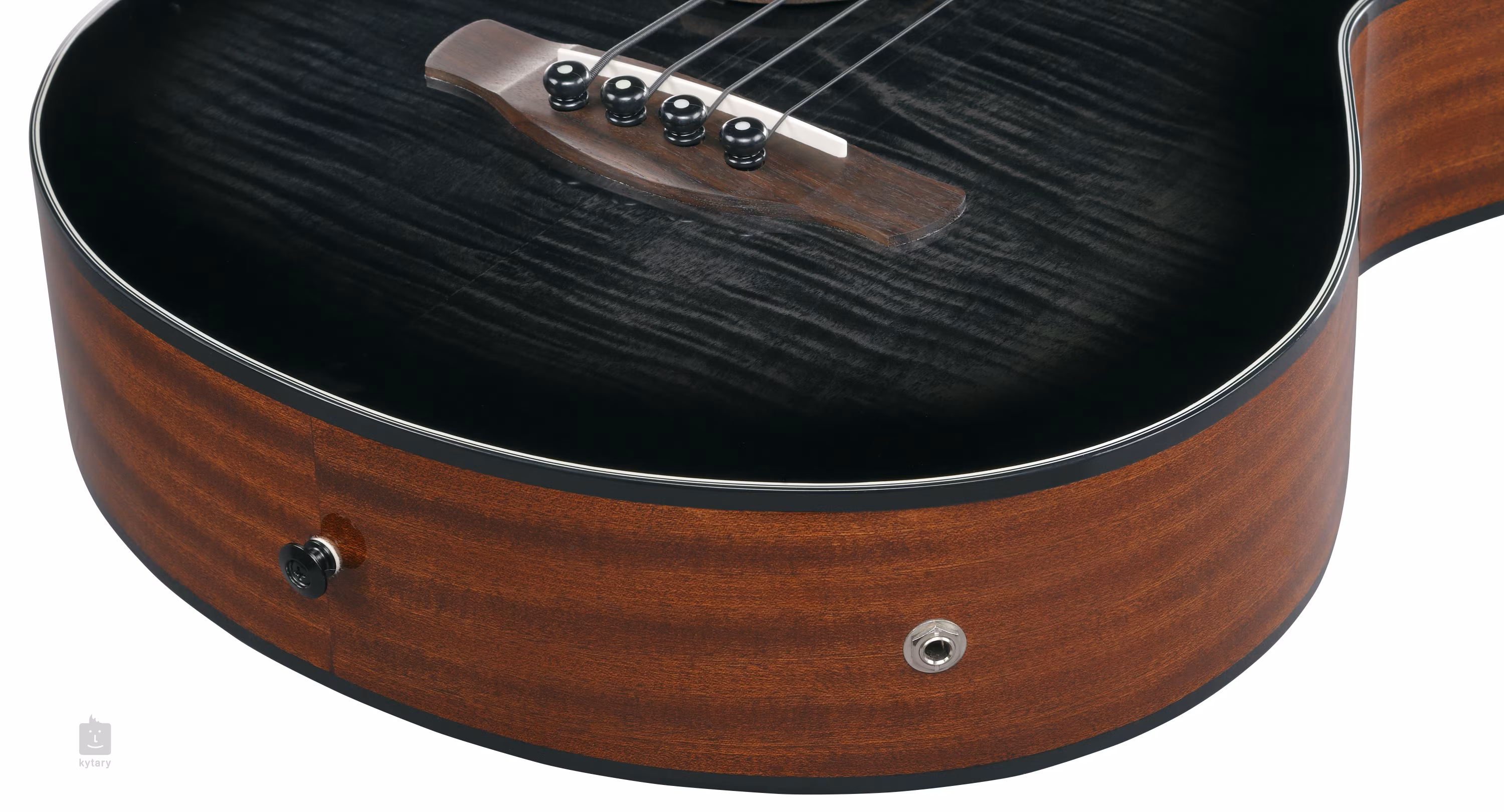 Elektroakustická baskytara AEGB25E Transparent Black se řadí mezi nástroje z modelové řady AE, které jsou díky svému většímu tělu přímo stvořené k hraní naživo – jak akusticky, tak i po zapojení do aparatury. Samozřejmostí je u těchto nástrojů velmi povedené zpracování a zvuk, který byste čekali od mnohem dražších nástrojů. Přední deska nástroje je zhotovena z laminovaného fládrovaného javoru, zadní deska a luby jsou vyrobeny z laminovaného sapele. Kresbu fládrovaného javoru zvýrazňuje lesklý lak a barevná úprava Transparent Black, přírodní úprava a lesklý lak zadní desky a lubů nechávají vyniknout kresbu sapele. Ke krku ze tří kusů nyatohu a javoru je přilepen palisandrový hmatník osazený jednadvaceti pražci. Struny jsou uchyceny ve firemních die-cast mechanikách a tvarované palisandrové kobylce. Pohodlí při hře zaručuje opěrka palce vyrobená ze dřeva merbau. O snímání zvuku se stará podkobylkový piezo snímač, doplněný o elektroniku Ibanez AEQ-2T, která vám kromě integrované ladičky poskytne také dvoupásmový ekvalizér a ovládání hlasitosti.