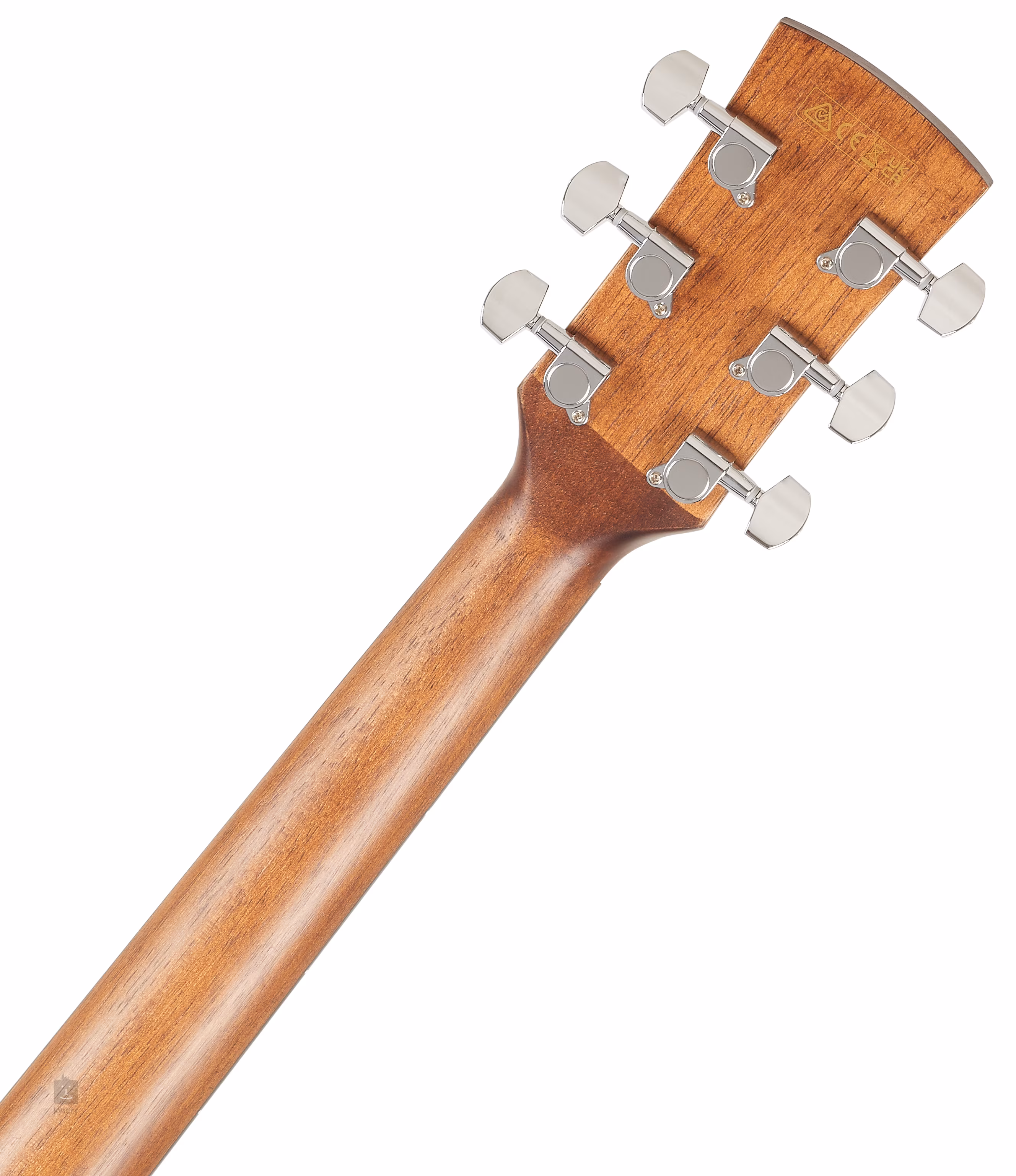 Tělo modelu Dreadnought AW1040CE-OPN je zhotoveno z okoumé - přední deska z masivu, zadní deska a luby z vrstveného okoumé. Ke krku z exotického dřeva nyatoh je přilepen hmatník z ovangkolu osazený dvaceti pražci. Orientaci po ploše hmatníku usnadňují bílé poziční tečky.