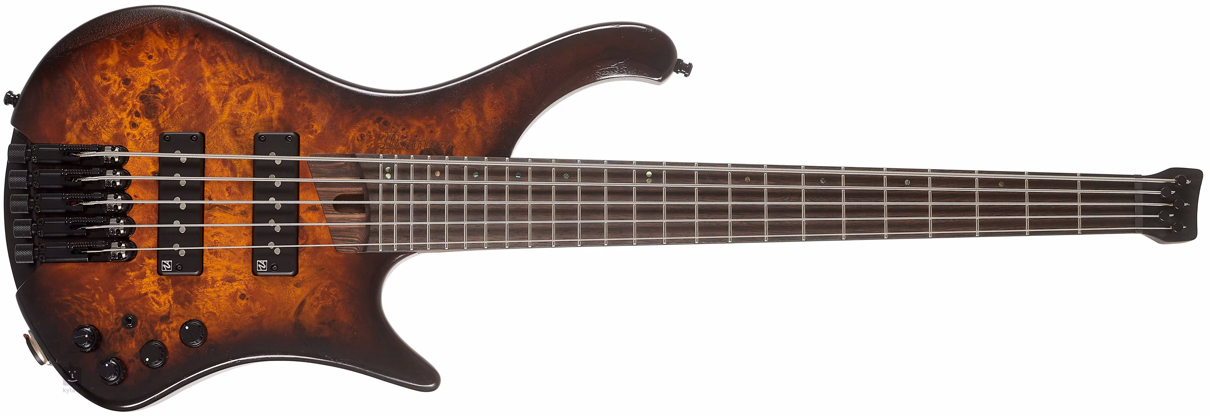 Pětistrunná baskytara EHB1505S Dragon Eye Burst Low je short-scale model s kratší menzurou (762 mm). Lehké komorované mahagonové tělo nástroje zdobí top z kořenice topolu s exkluzivní kresbou. K přišroubovanému krku z devíti kusů ořechu a dřeva panga panga je přilepen hmatník z panga panga osazený čtyřiadvaceti pražci z nerezové oceli velikosti Medium. Krk zpevňují grafitové výztuže, hmatník zdobí offset perleťové polohové tečky (abalone).