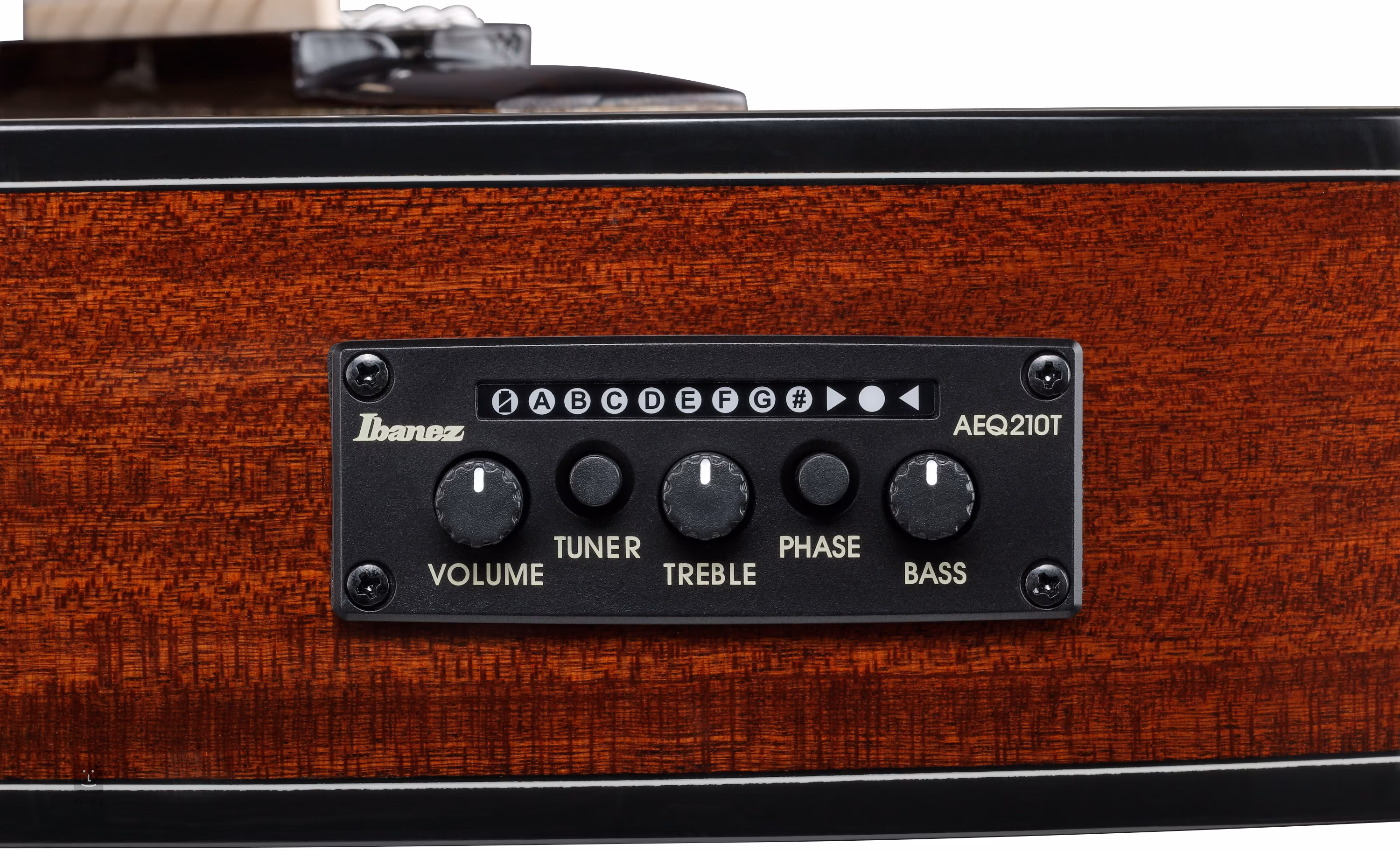 O věrný přenos zvuku se stará podkobylkový piezo snímač a předzesilovač Ibanez AEQ210T s dvoupásmovým ekvalizérem, invertorem fáze a zabudovanou ladičkou. Signál z kytary pošlete ven nástrojovým kabelem (Jack 6,3 mm) nebo symetrickým XLR výstupem. Struny jsou uchyceny ve firemních ladicích mechanikách ve zlatém provedení s černými kolíčky a palisandrové kobylce. Pěkné zpracování podtrhuje oboustranná černá obvodová lemovka těla a dekorativní rozeta.