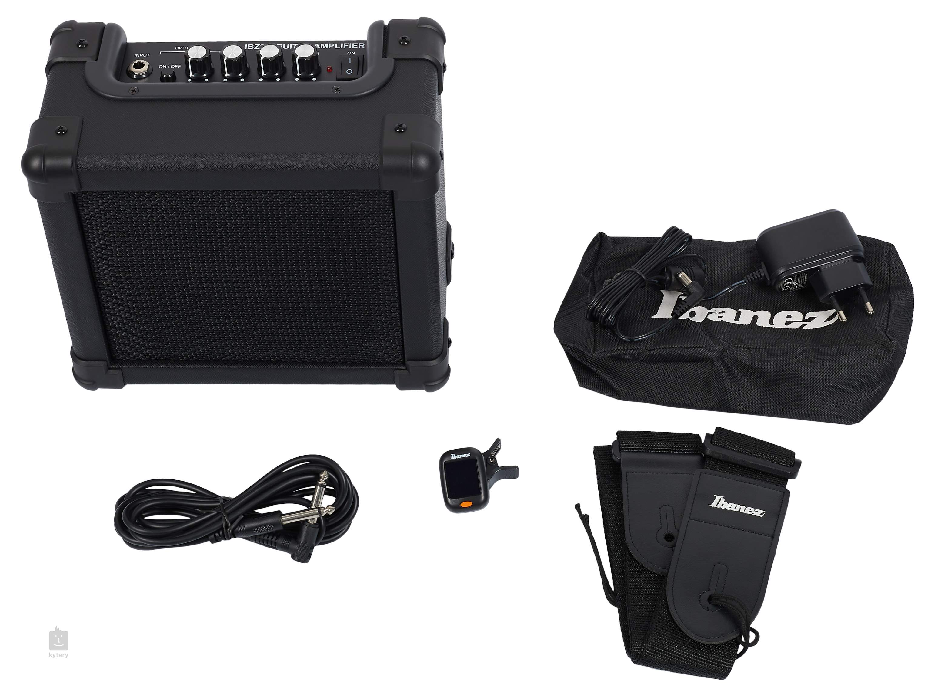 Součástí packu je desetiwattové kytarové kombo, obal na kytaru (gig bag), ladička, kytarový popruh, nástrojový kabel, trsátka a obal na příslušenství s logem Ibanez.