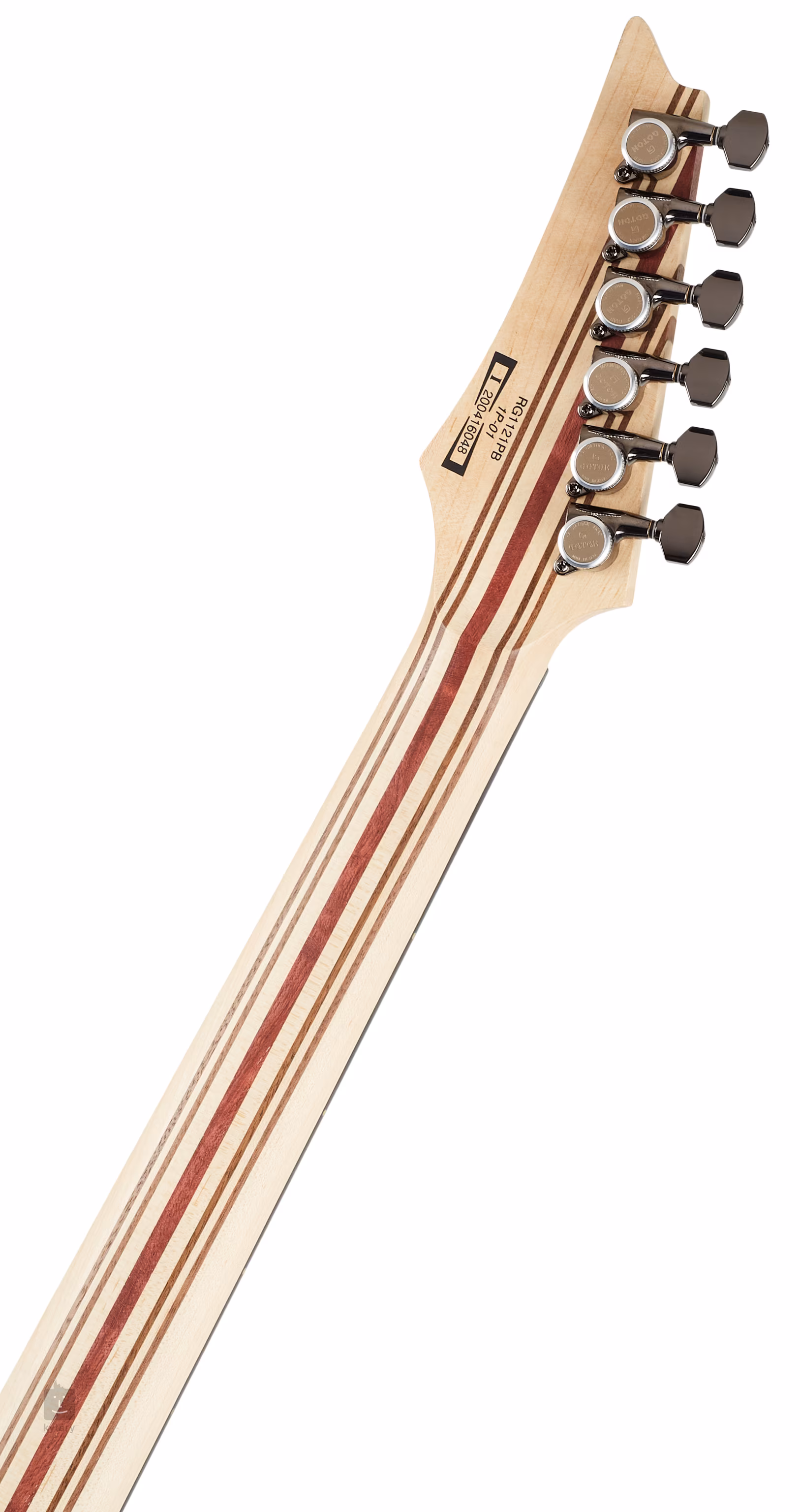 Lipové tělo modelu RG1121PB-CIF zdobí efektní vrchní dýha z topolu (poplar burl) s pěknou kresbou dřeva. K tenkému rychlému krku s profilem Wizard složeného z jedenácti kusů dřev javoru, ořechu a bubingy je přilepen ebenový hmatník osazený čtyřiadvaceti pražci ve zlatém provedení (Jescar EVO Gold). Zaoblené hrany pražců vám poskytnou větší herní komfort (Premium fret edge treatment), orientaci po ploše hmatníku usnadňují offset perleťové polohové tečky (Mother-of-Pearl) a luminiscenční tečky na boku.