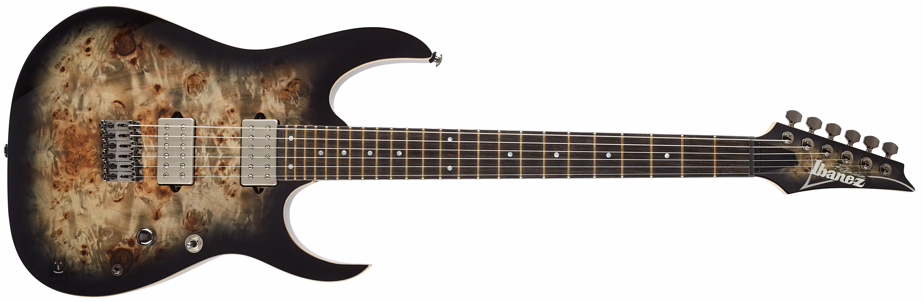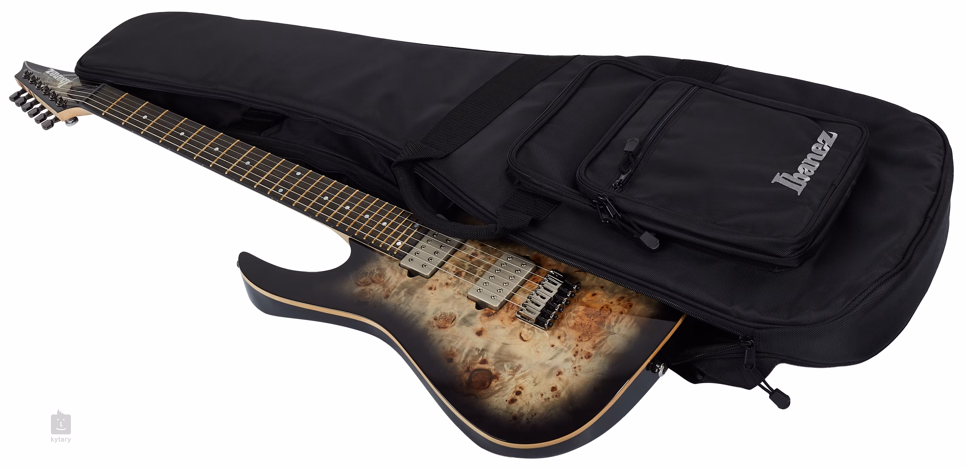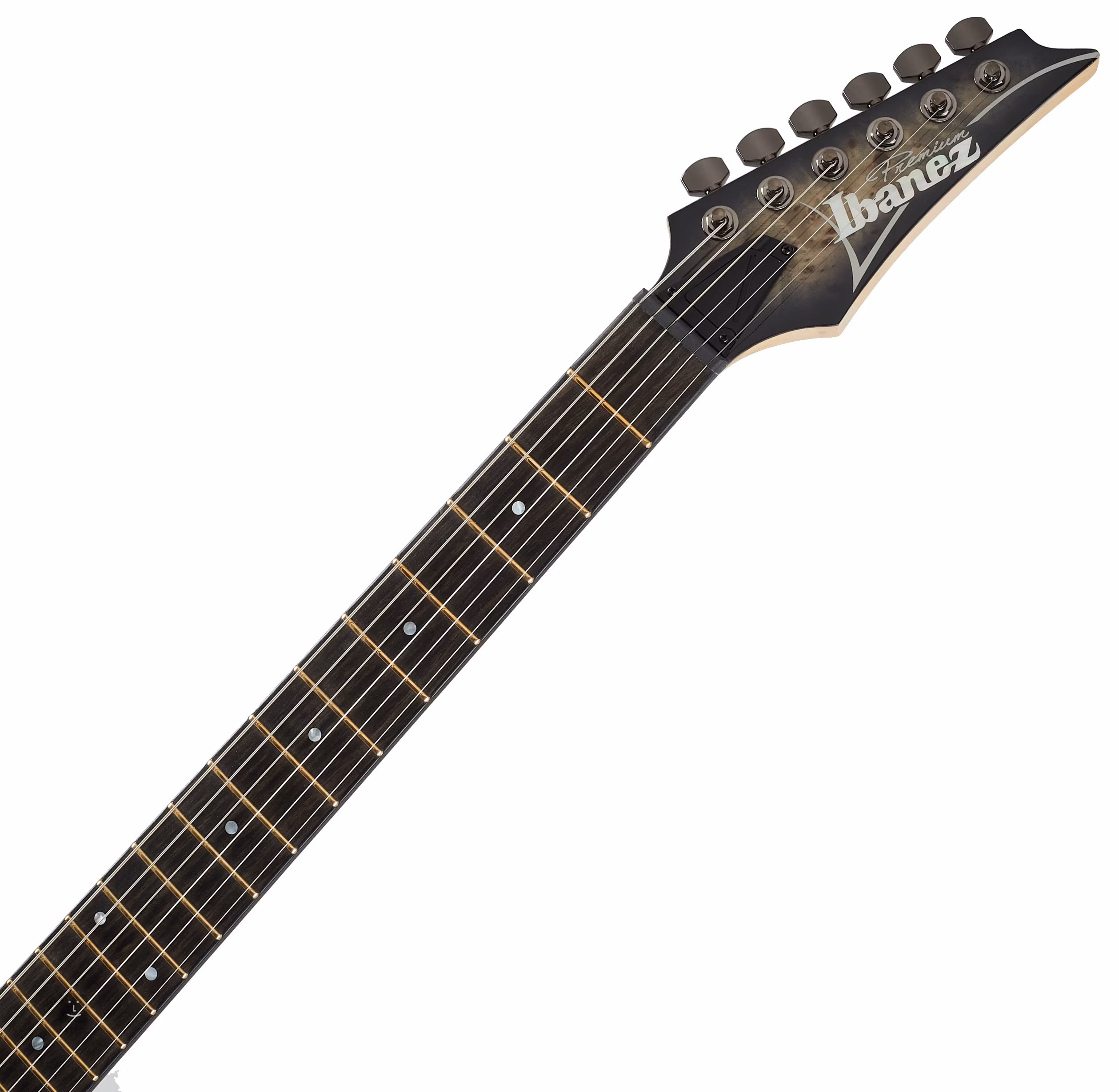 Lipové tělo modelu RG1121PB-CKB zdobí efektní vrchní dýha z topolu (poplar burl) s pěknou kresbou dřeva. K tenkému rychlému krku s profilem Wizard složeného z jedenácti kusů dřev javoru, ořechu a bubingy je přilepen ebenový hmatník osazený čtyřiadvaceti pražci ve zlatém provedení (Jescar EVO Gold). Zaoblené hrany pražců vám poskytnou větší herní komfort (Premium fret edge treatment), orientaci po ploše hmatníku usnadňují offset perleťové polohové tečky (Mother-of-Pearl) a luminiscenční tečky na boku.
