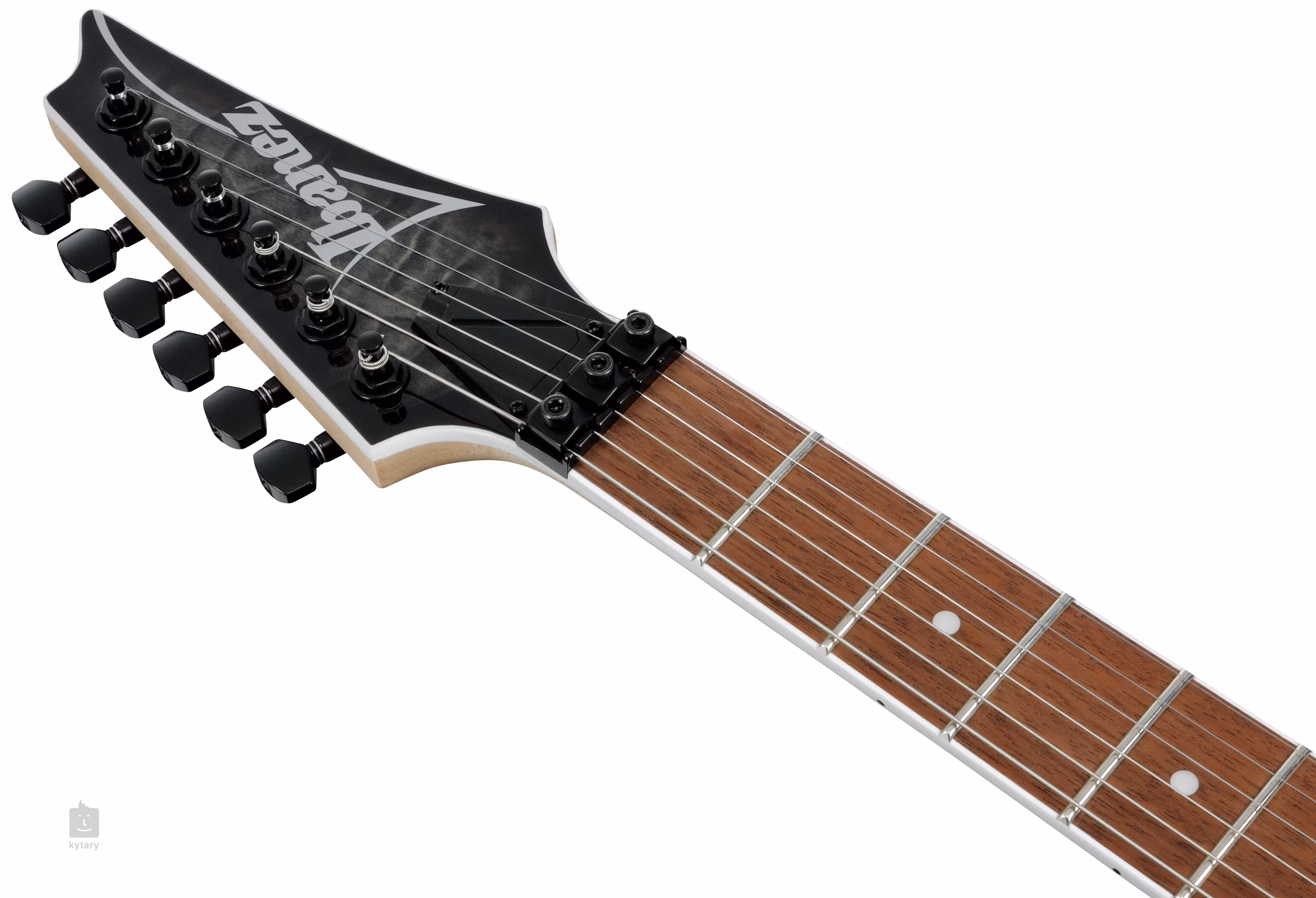 Tělo kytary RG450QMB Transparent Gray zhotovené ze dřeva meranti zdobí efektní dýha z obláčkového javoru. Kresbu obláčkového javoru zvýrazňuje lesklá barevná úprava Transparent Gray. K rychlému javorovému krku s profilem Wizard III je přilepen hmatník z jatoby osazený čtyřiadvaceti pražci velikosti Jumbo.
